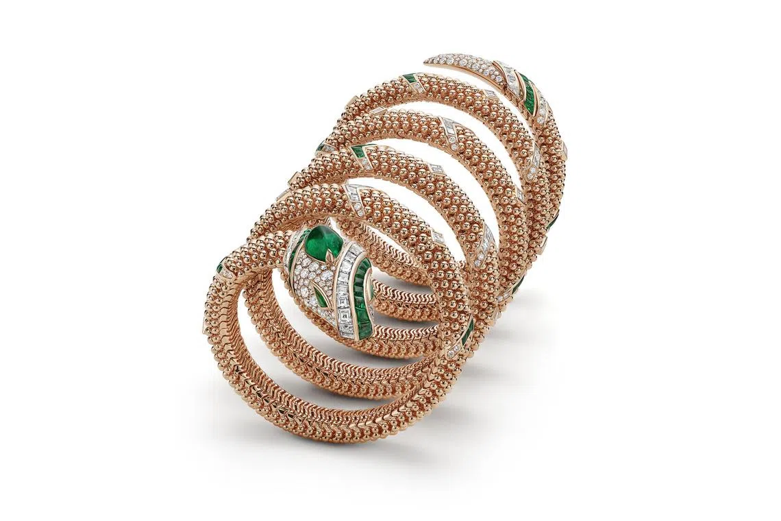The unmistakable snake gets a brilliant pink gold treatment in this necklace ($987,000) set with fancy-shape diamonds and emeralds, anchored by a 2.72-carat pear-shape emerald atop the serpent’s head.