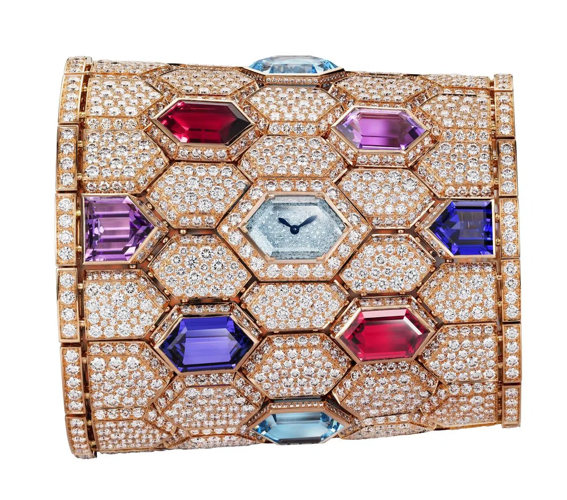 Part of a new chapter in Bulgari’s Colour Treasures series, the jewellery-watch hides a diamond-set dial behind a faceted, hexagonal transparent topaz of more than five carats.