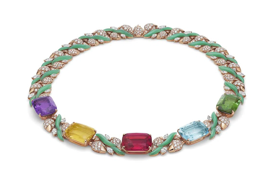 Set with chrysoprase elements, diamonds and five cushion-cut gems totalling nearly 80 carats (a 22.85-carat rubellite, 21.69-carat topaz, 19.56-carat green tourmaline, 18.31-carat orange beryl and 17.06-carat amethyst), it is part of Bulgari’s Colors of Eden series, drawing inspiration from the Garden of Eden.