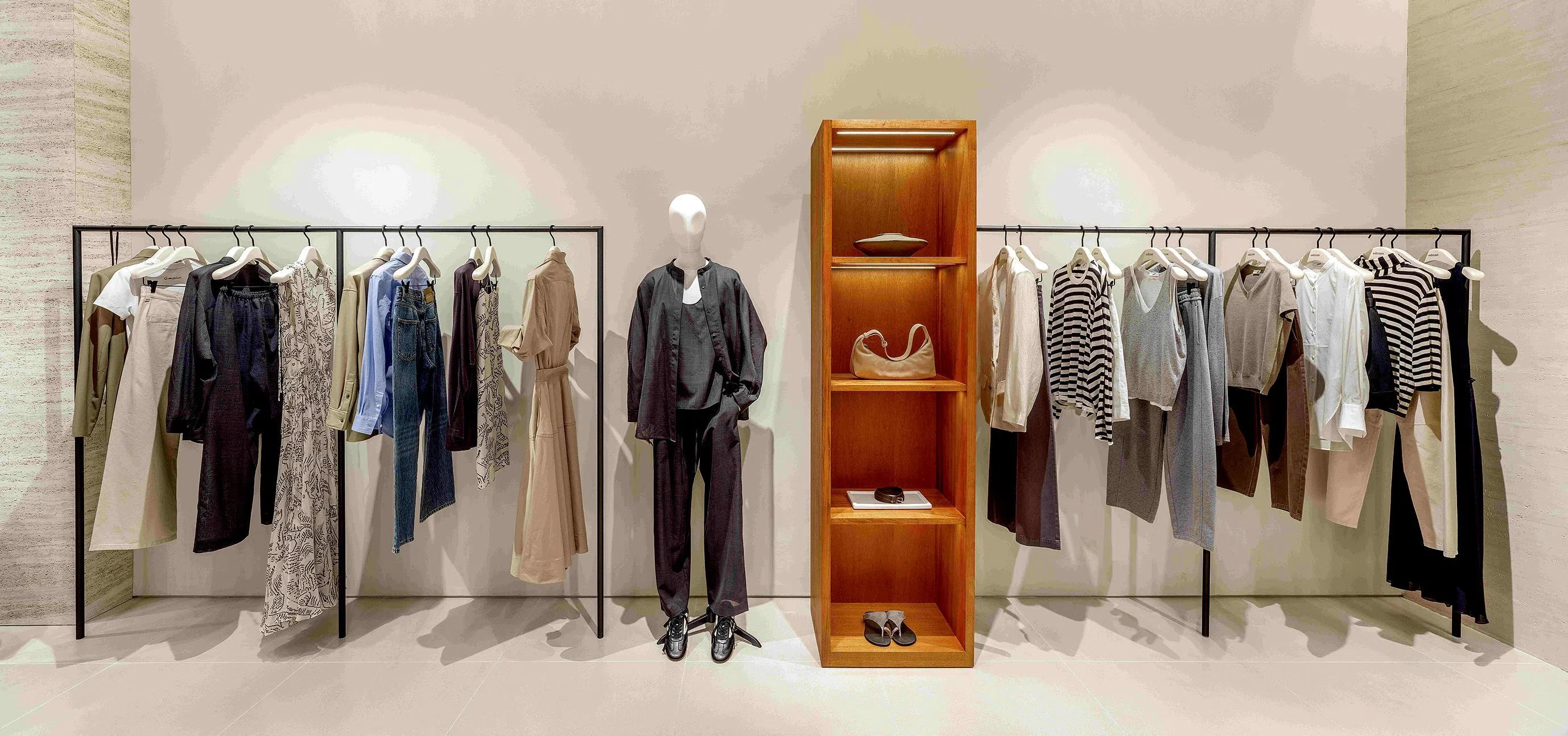 The shop has a calming palette of off-white, muted sage and soft grey, accented by translucent orange panels and live plants. The spaced-out clothing racks encourage unhurried browsing and display the brand’s A/W 2025 collection.