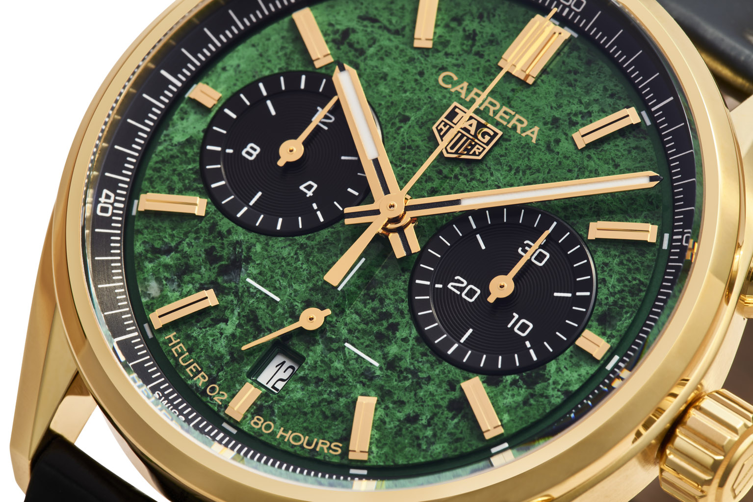 Available at Cortina Watch boutiques, the 10-piece-only watch is paired with a black alligator leather strap with green stitching that matches the dial. And as a nod to the anniversary, the caseback bears a special inscription.
