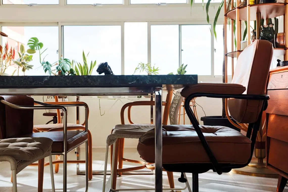 Central to her living room is a striking green marble dining table, surrounded by a diverse collection of chairs. This piece not only anchors the space, but also mirrors her eclectic taste.