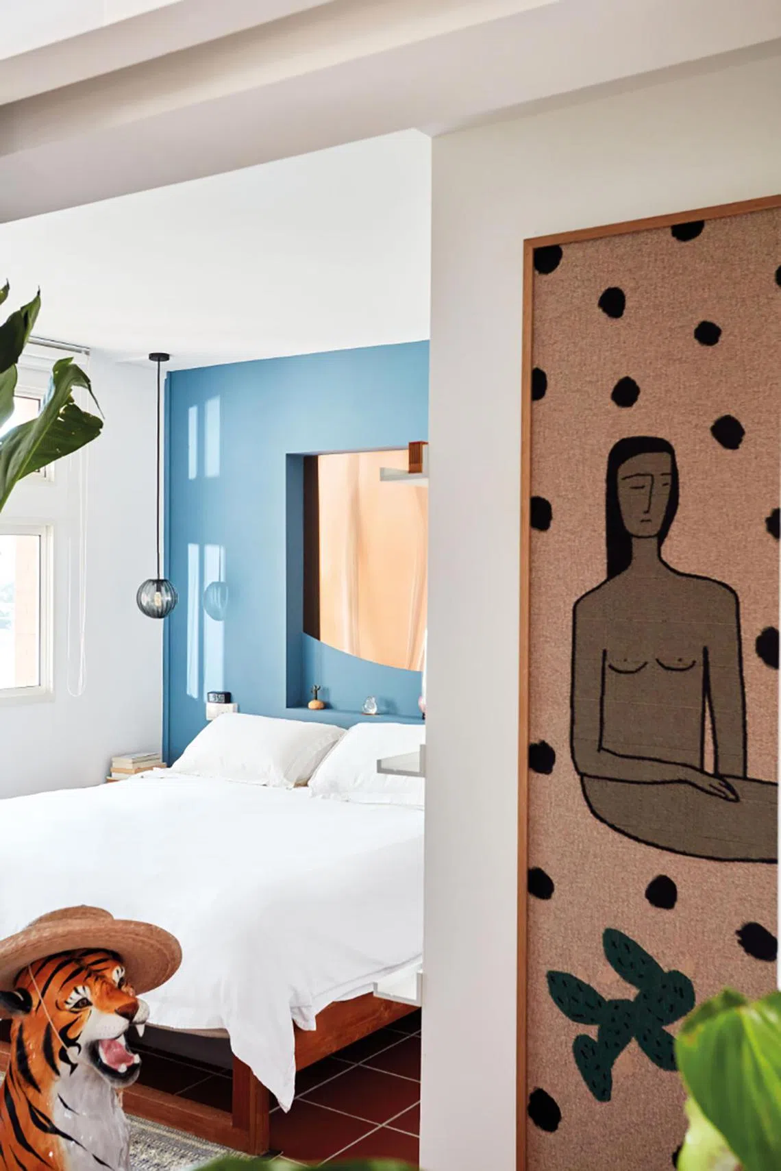 The thoughtful approach to decor, emphasising personal connections and memories, is evident throughout her home, including the guest bedroom where another tapestry art piece takes centre stage.