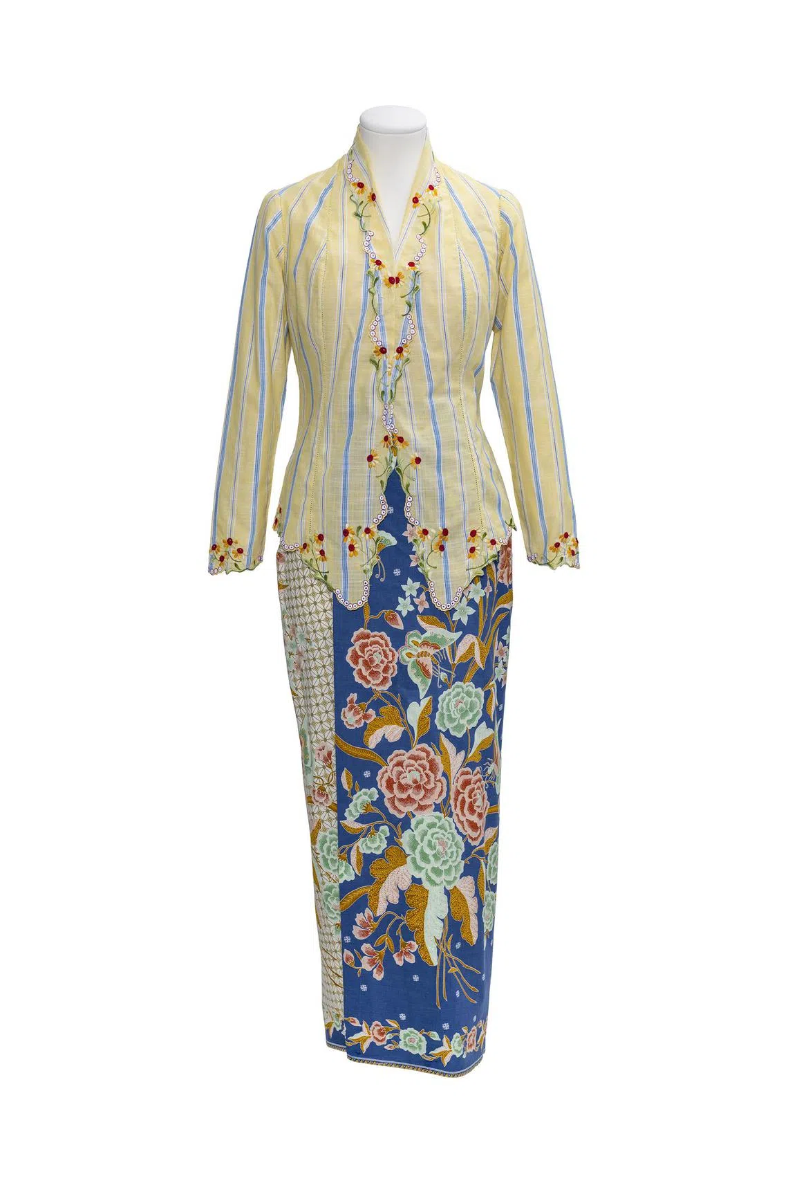 The first is a yellow kebaya with blue stripes decorated with daisies, which symbolise innocence, happiness and loyalty – key traits of Xinniang. The kebaya is paired with a bright blue batik sarong. This costume is on display at the Peranakan Museum.
