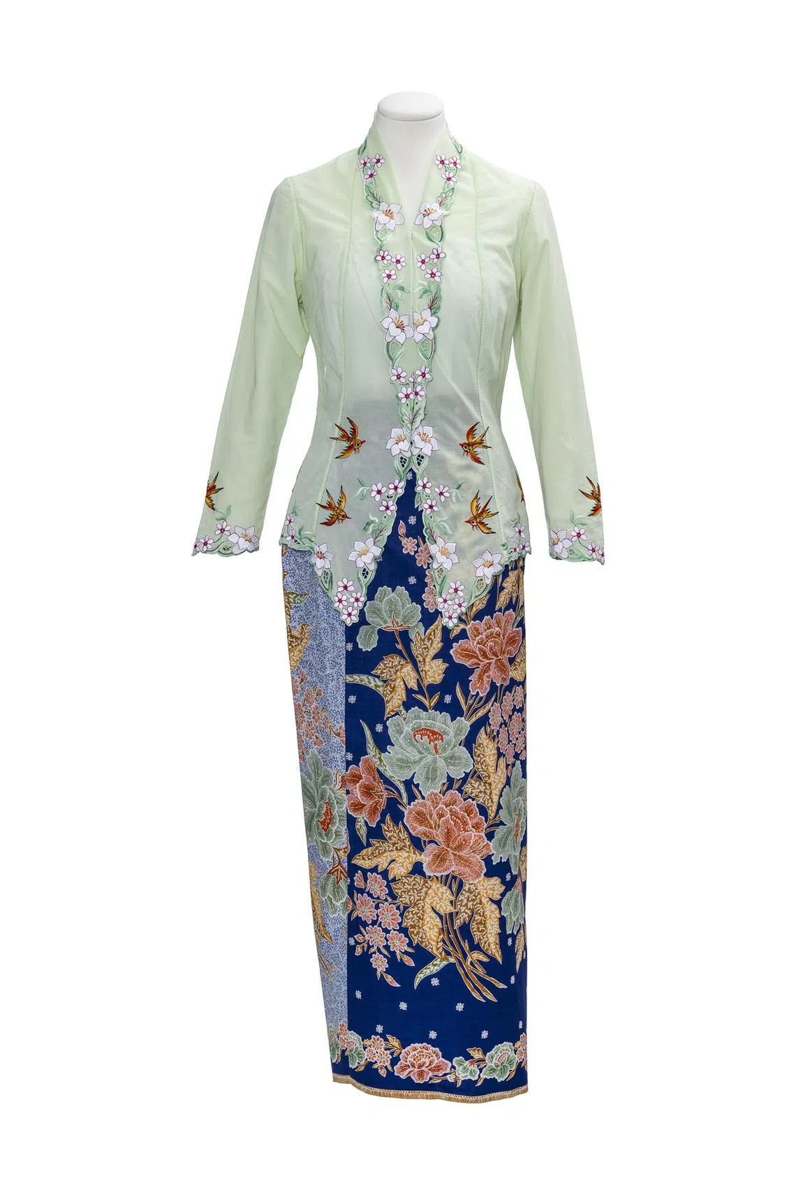 Swallows and peach blossoms feature in Ferlyn Wong’s kebaya, one of the four Emerald Hill ensembles donated to the Peranakan Museum.