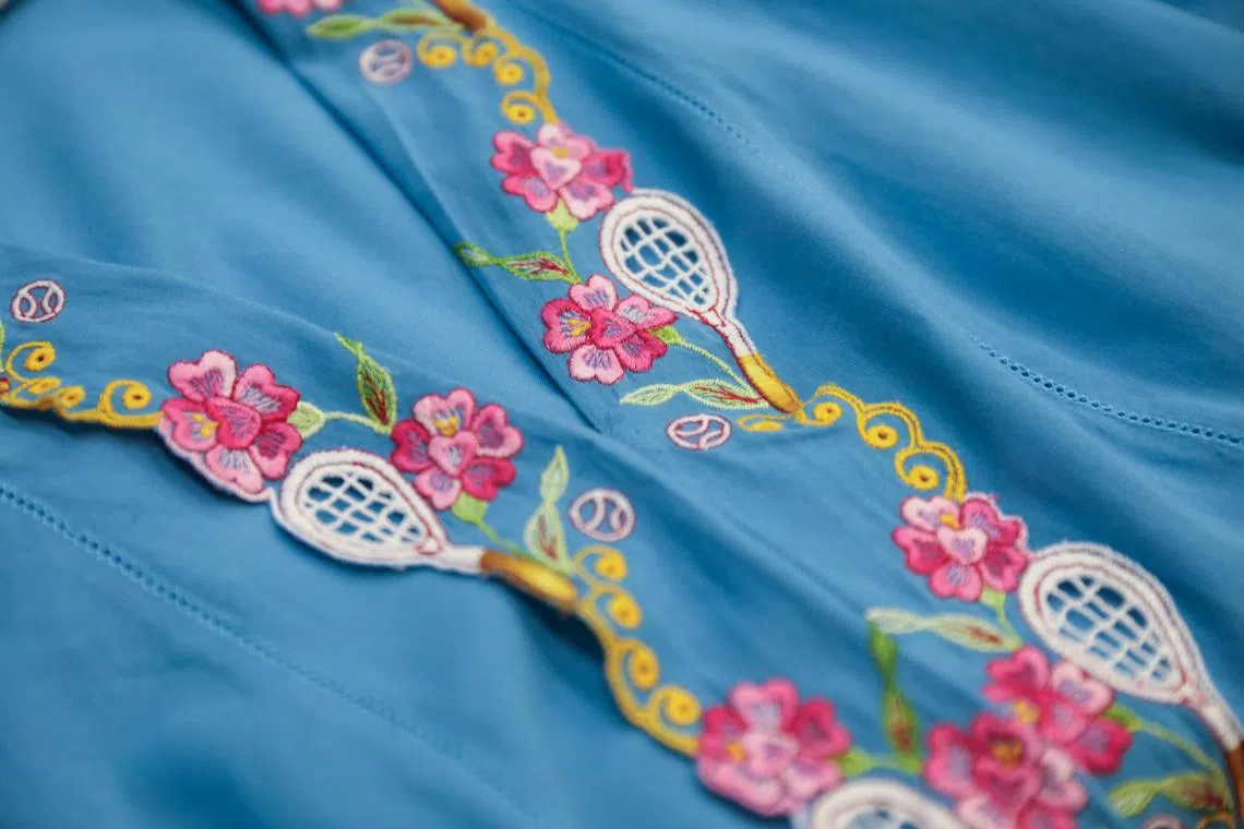 As she rarely wears the kebaya, the only piece she owns has to be loud and one that commands attention. Mr Wong envisioned a bright blue kebaya where the key design elements are tennis rackets and balls, as Yinniang loves the sport.