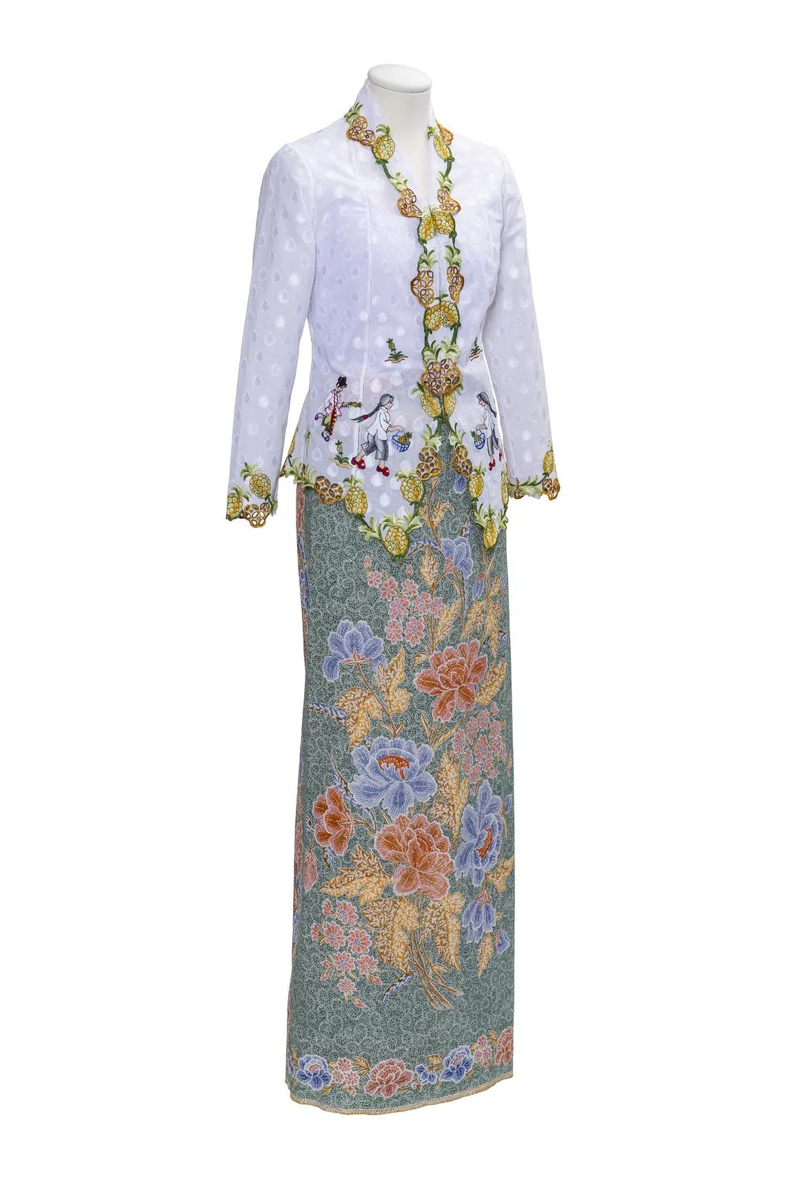 A kebaya with embroidery featuring pineapples and a Nonya and her ma jie is worn by Jeanette Aw in Emerald Hill – The Little Nyonya Story. The outfit is on display at the Peranakan Museum.