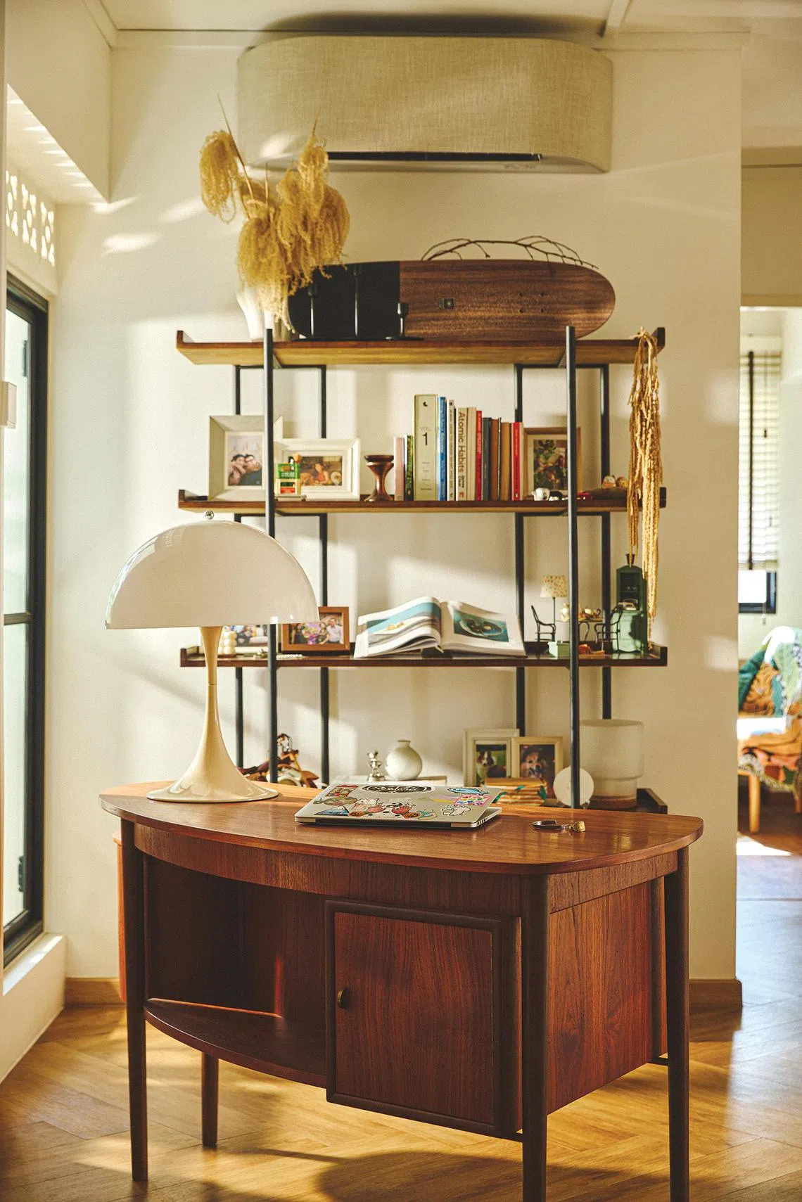 Another key nook in the home is the study area that has been carved out from the main living space without the use of walls or dividers. The area also features a study desk that has a kidney-bean shape and is a 1960s Danish piece from local store Noden.