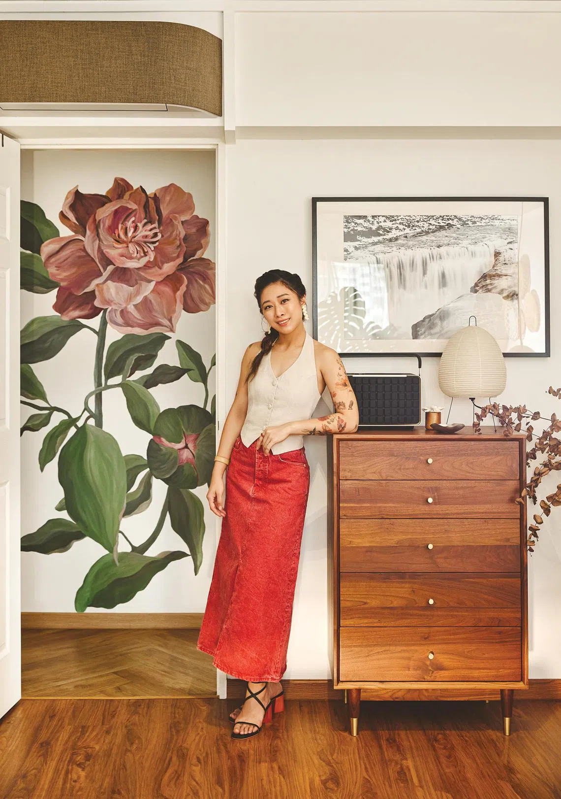 “We made sure to keep our walls bare and white as a clean canvas for any artwork we put up. Over the years, the wall spaces were slowly filled up with our guitars, art and photos, and my very first mural that kick-started my mural painting career. This was done on a bare wall directly facing the master bedroom,” she says.