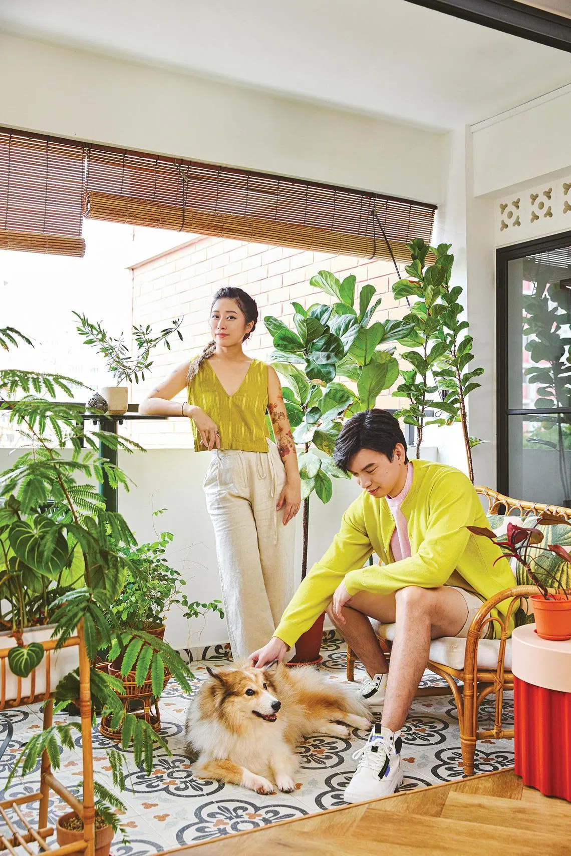 Ms Geraldine Toh, her husband Vincent Lim and their dog, Luna, in their plant-filled balcony.