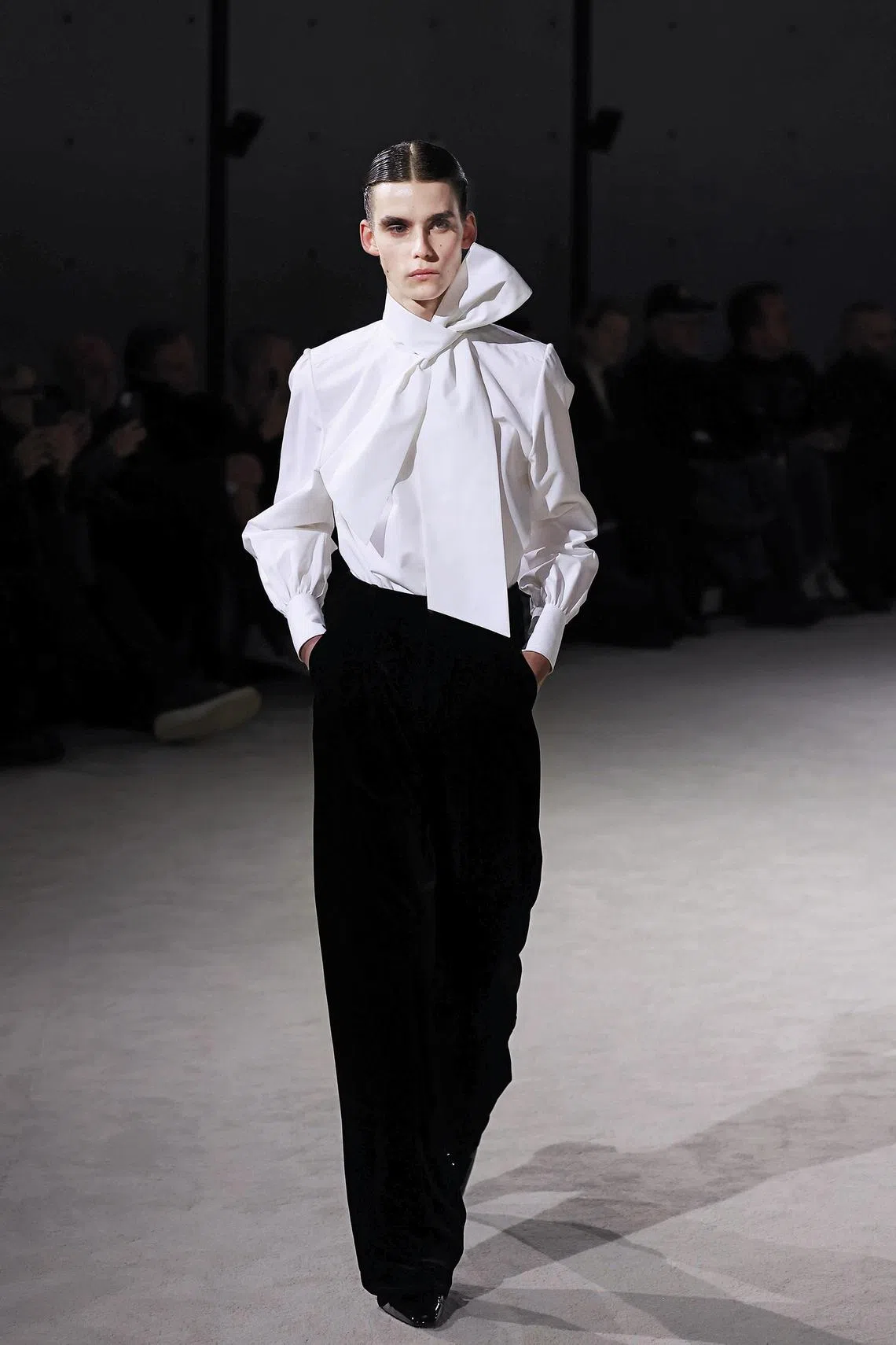 Now, his successor Anthony Vaccarello is channelling that contrarian spirit and doing the inverse – applying the language of Saint Laurent’s womenswear into menswear. This meant silk and chiffon blouses, giant pussybows, floor-sweeping coats and vertiginously heeled boots.