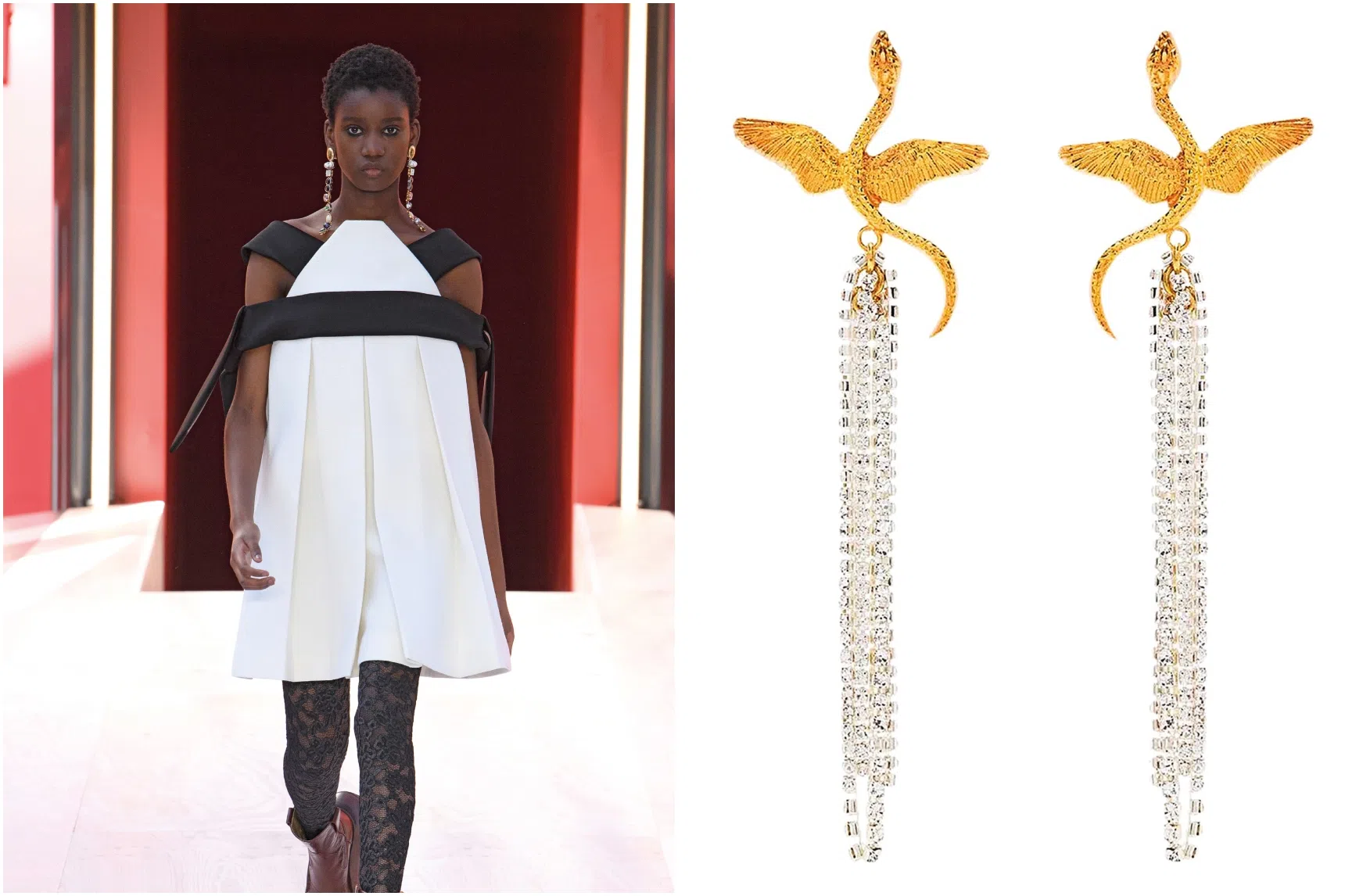 Welcome back the shoulder duster. Chanel’s ultra-bling versions lend glamour to the monochrome tweed sets, while Louis Vuitton’s multicoloured gem earrings add interest to a black and white mini dress.
