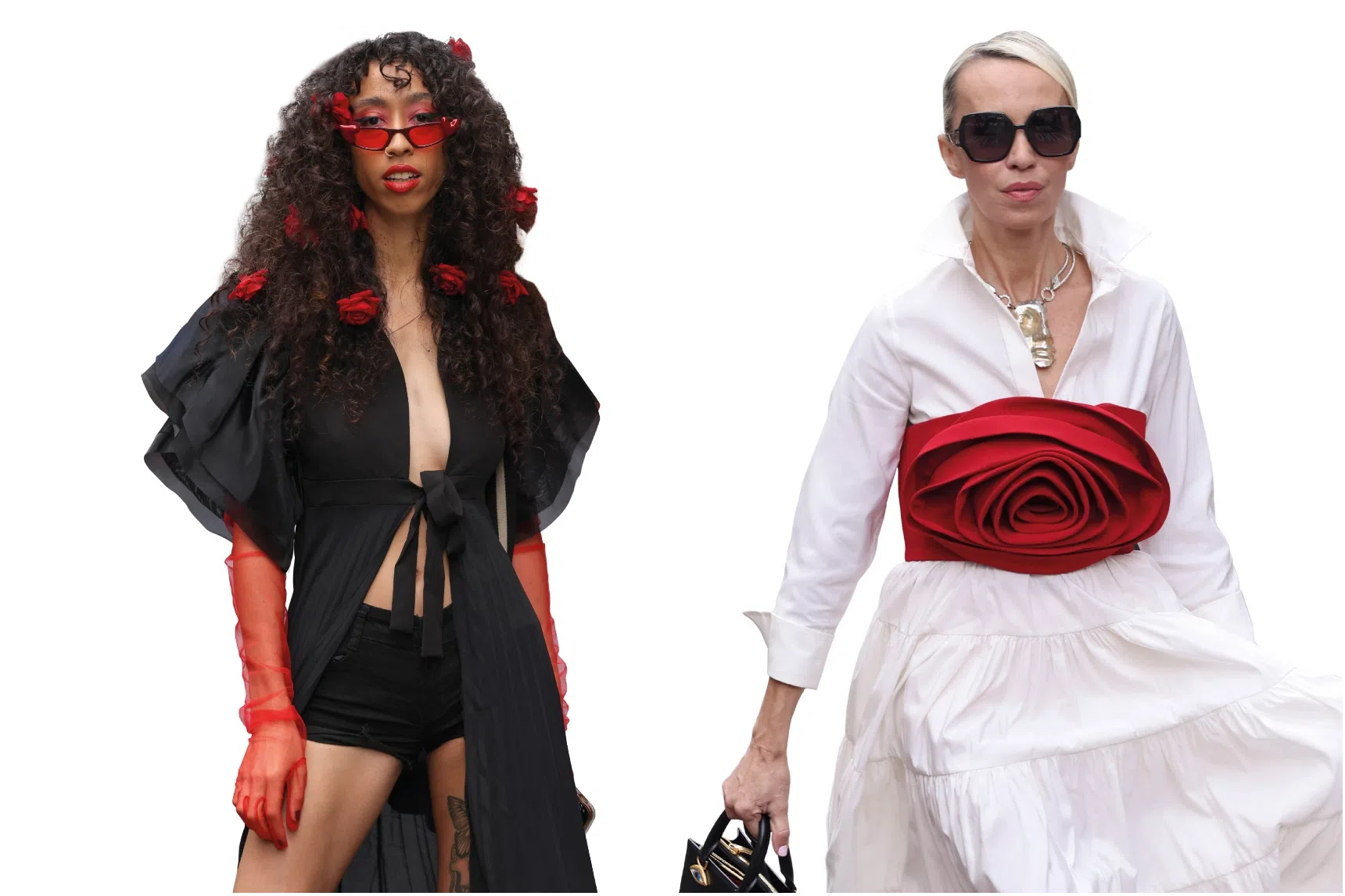 Tiaras are no longer the exclusive purview of royalty, brides or beauty queens. Spotted on the street set is an entire spectrum of fancy toppers – spiky diadems, gothic crowns, feather and floral headpieces – worn with gowns, maxi dresses, even a bralette and shorts combo.