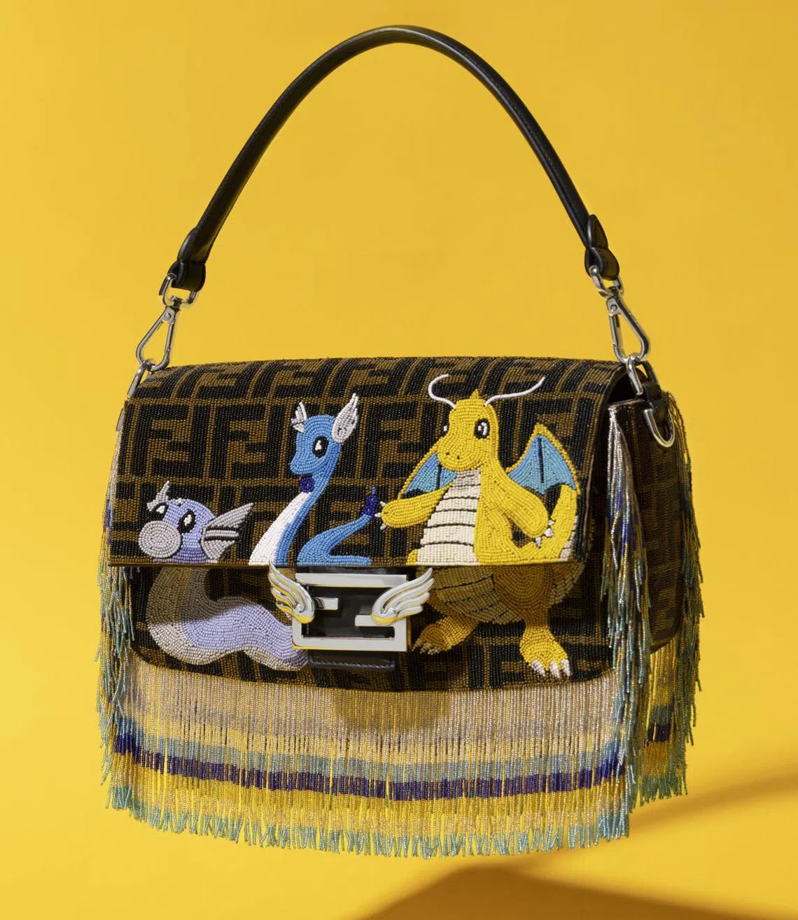 A show-stopping piece is the beaded Baguette ($12,400) – embroidered entirely with beads that create the FF motif and the Pokemon in all three stages of evolution. Embellished with an FF clasp with metal wings and multicoloured beaded fringe, it is a collector’s item.