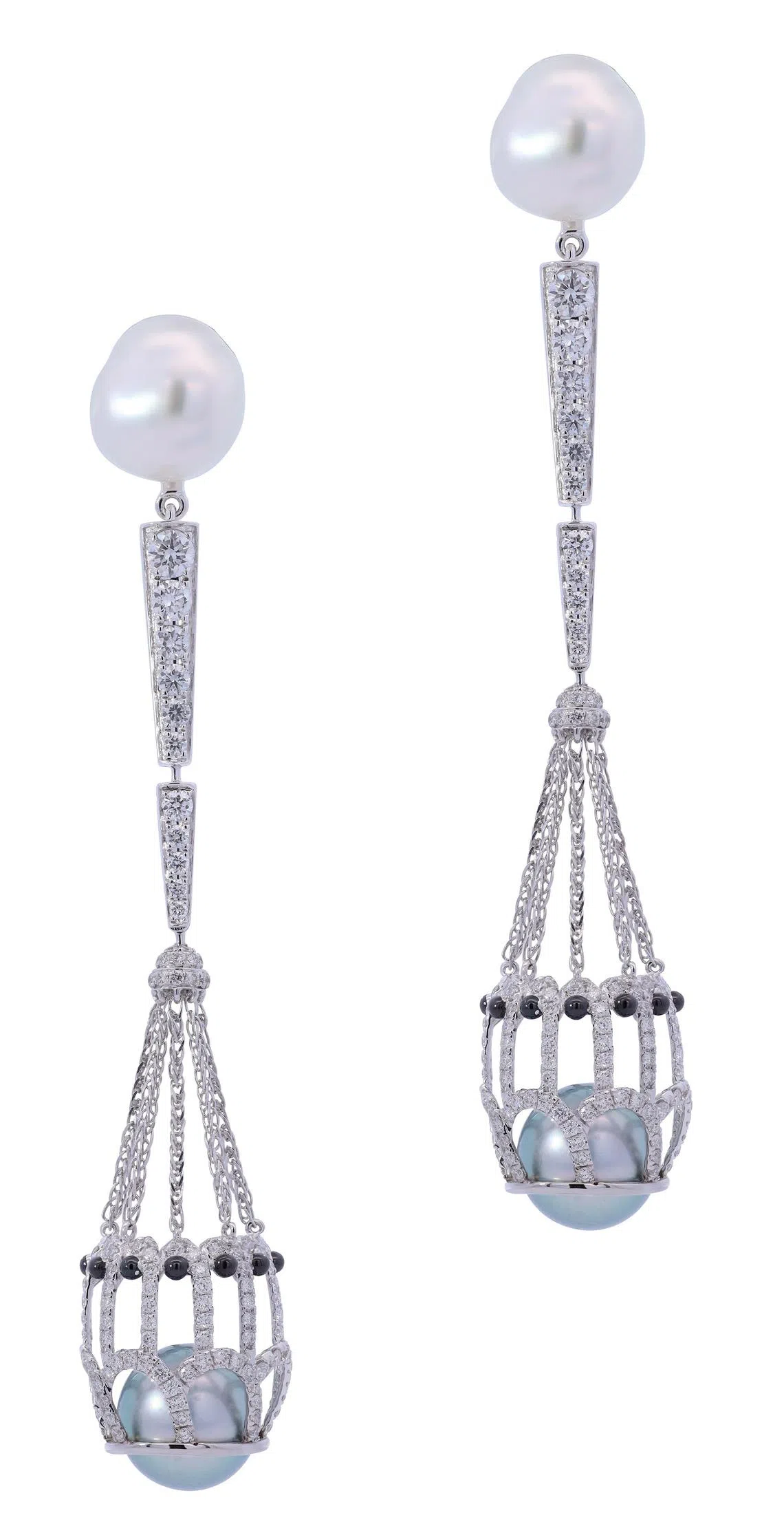 The Grand Chandelier earrings in 18K white gold, diamonds, South Sea Keshi and Tahitian pearls, Simone Jewels, $21,800.