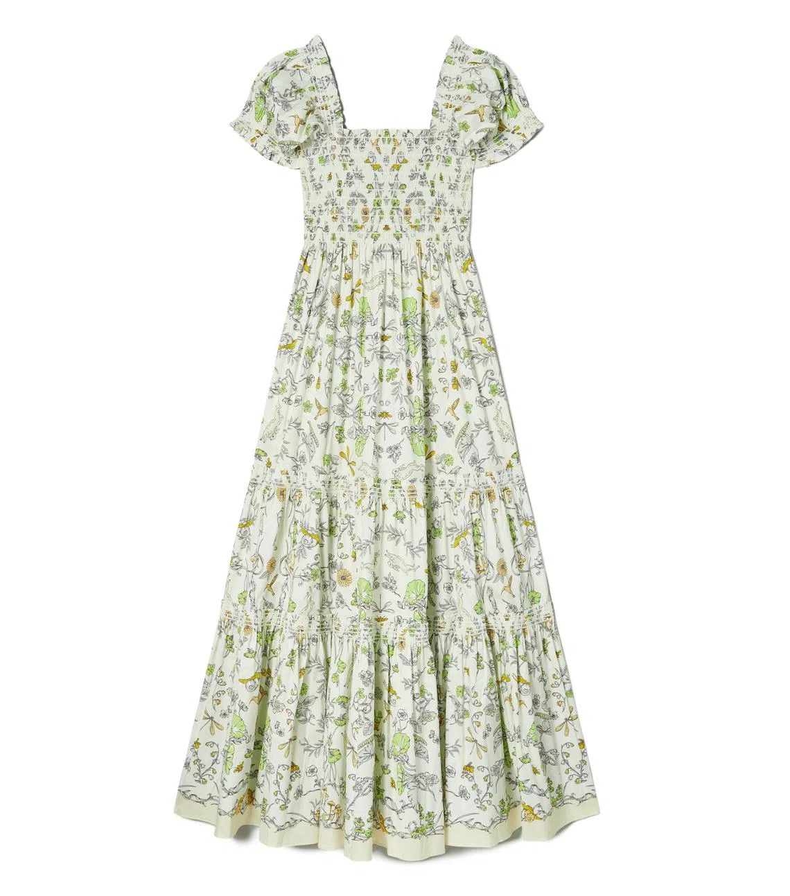 Printed Cotton Smocked Dress in Beige Meadow, $920.