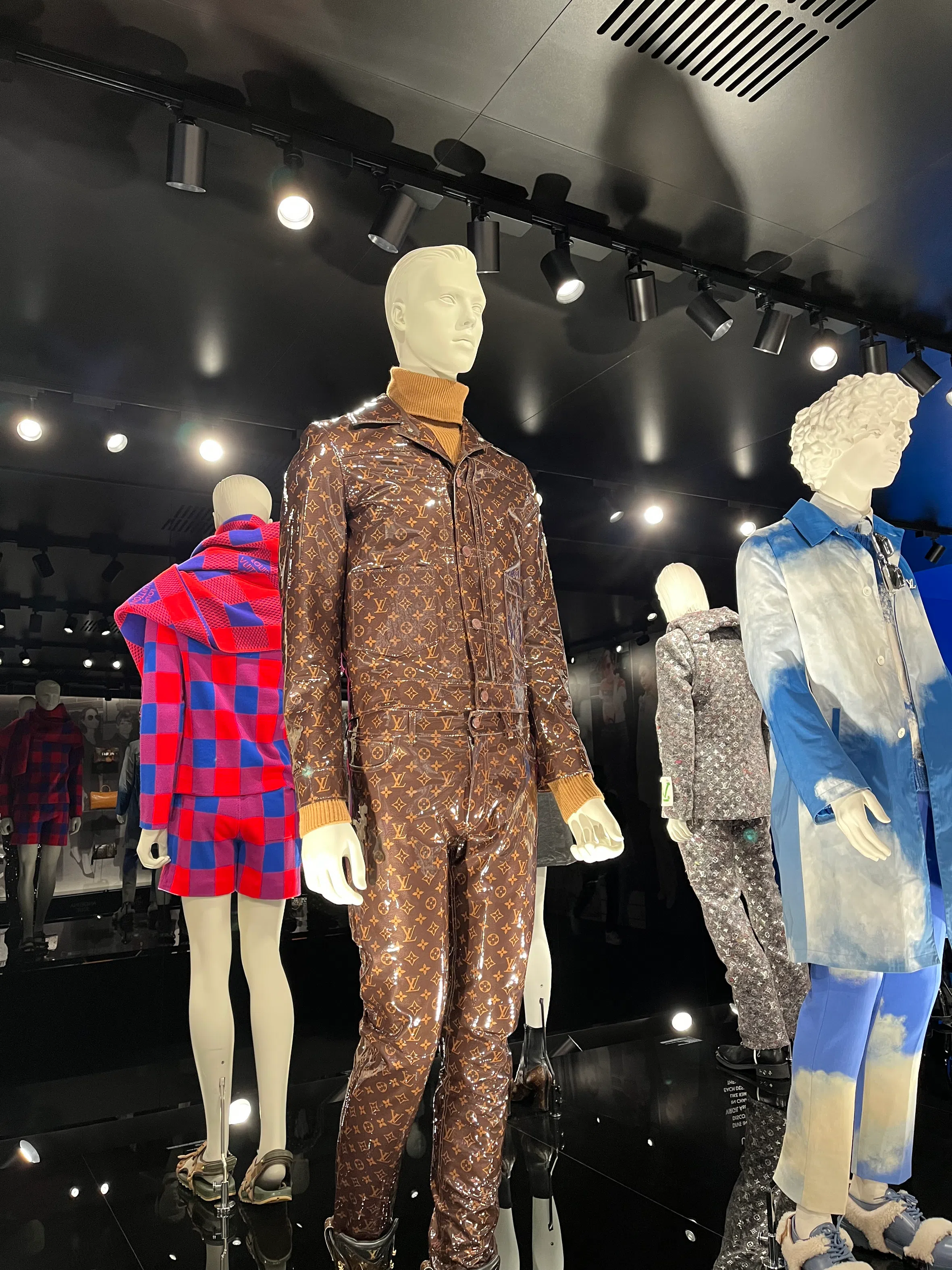 The designer honoured the famous monogram canvas with a jacket-and-trousers set emulating the Monogram Vernis canvas – the brand’s embossed patent leather that gives a glossy effect, which was used in its leather goods creations in the 1990s.
