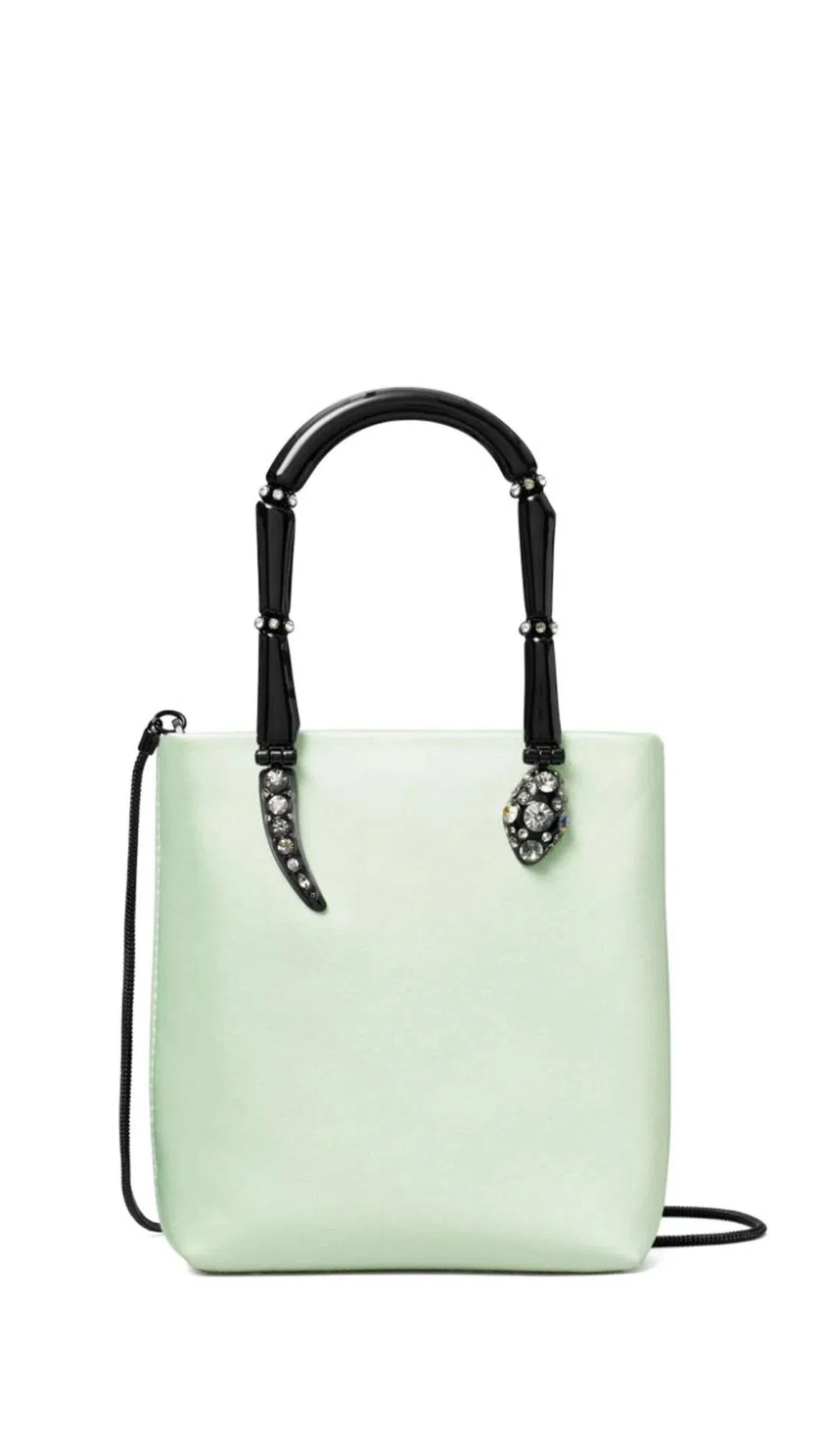 In the Satin Snake Handle Mini Tote ($1,350), the enamel handles have been expertly crafted to evoke the sinuous curves of the reptile, finishing in a rhinestone-embellished head and tail on the mint bag.
