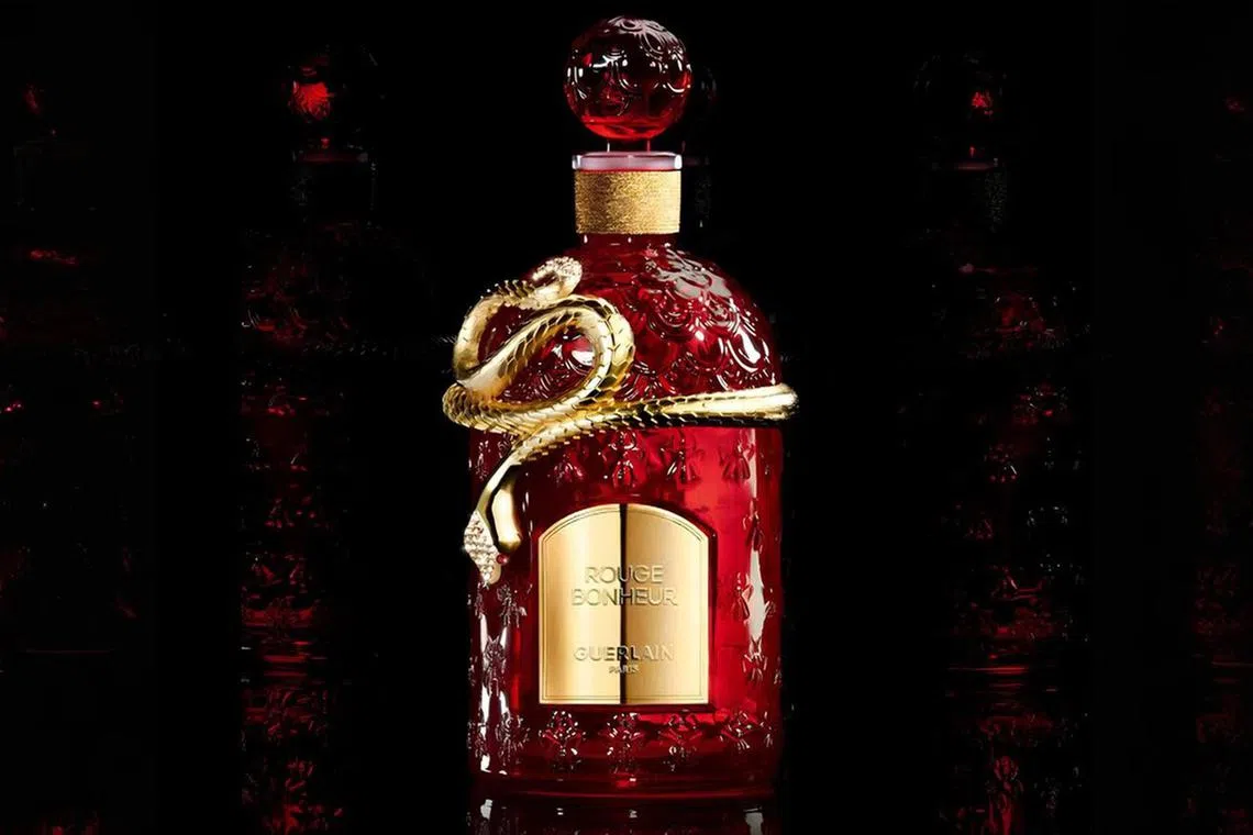 The show-stopping topper is a sumptuous snake-shaped jewel gilded in fine gold and set with Swarovski rhinestones. Titled Rouge Bonheur ($1,300), the perfume is a spicy and sparkling floral fragrance.