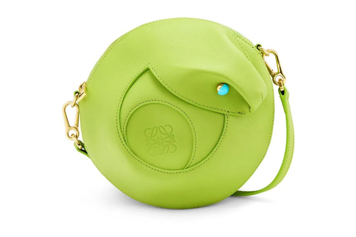 Cloisonne also inspired a capsule collection of ready-to-wear, shoes, accessories and a series of special edition bags. The Snake Bag in Smooth Calfskin ($2,550), a variation on Loewe’s signature animal-shaped designs, depicts a green bean-hued snake coiled in rest.