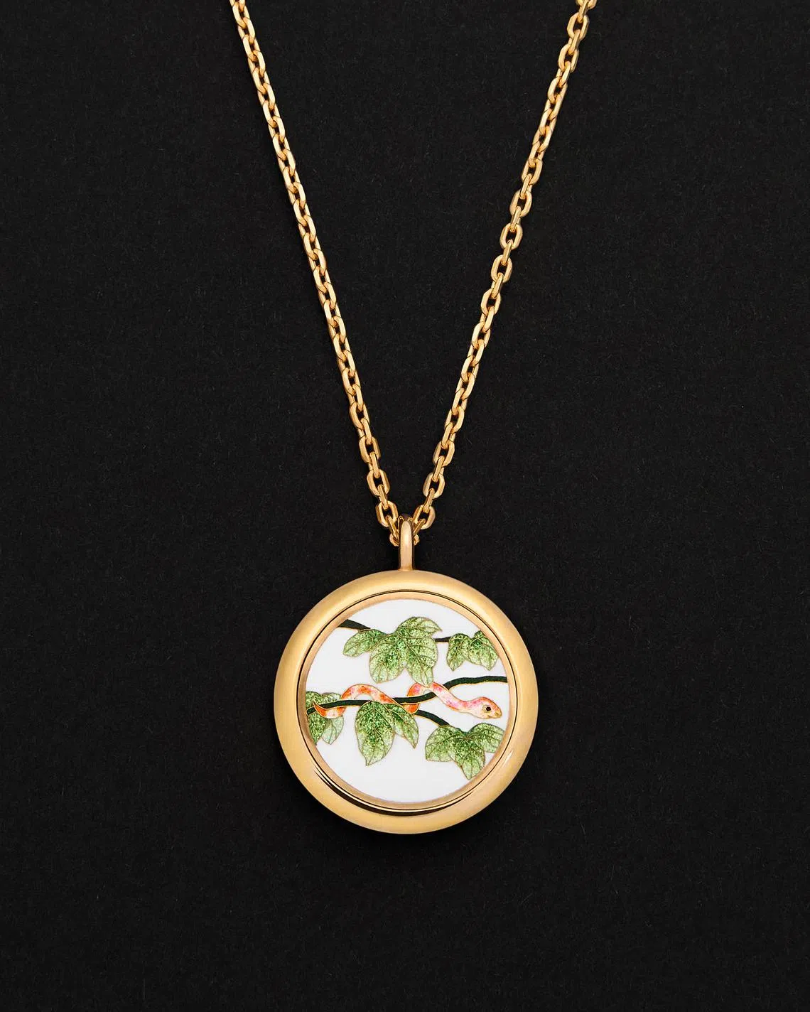 Loewe partnered Chinese third-generation enameller Xiong Songtao to create two sets of cloisonne works: a Nest bag with snake head and lotus cloisonne details, and necklaces with cloisonne pendants (price on request) featuring snake, monkey and cloud motifs.