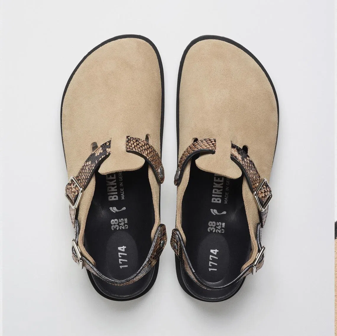 The series features new variations on three Birkenstock classics. The double-strap Arizona ($605) and three-strap Florida ($570) are redesigned in deluxe Italian leather with all-over python embossing, while the Tokio ($745) is revisited in contrasting combinations of soft suede with python-embossed leather details.
