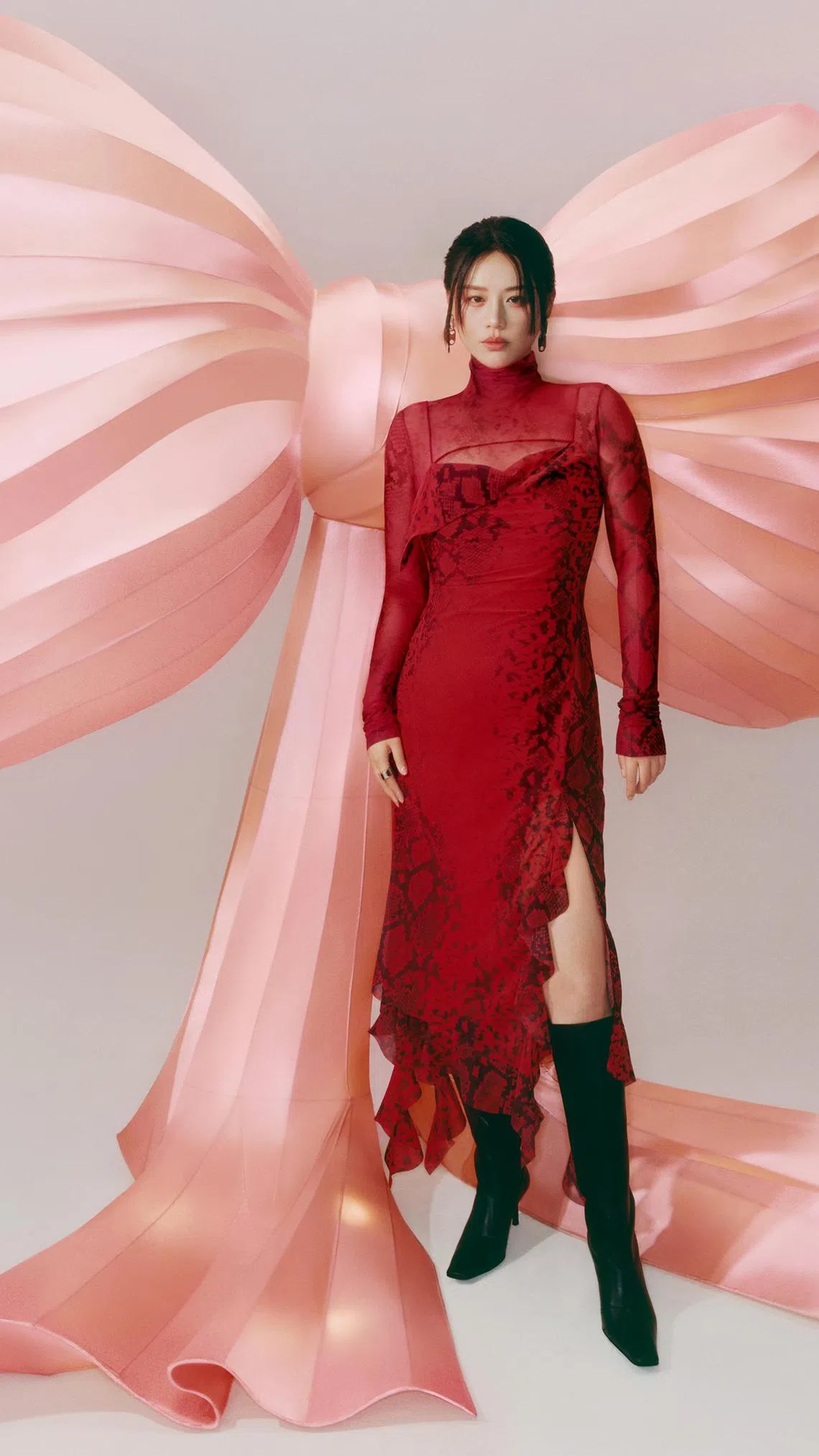 Python-print clothing is the star of the capsule – appearing across a slinky satin dress ($960), printed denim trousers ($1,200), button-up printed shirts ($900) and a key Ruffle Strap Dress in auspicious crimson ($1,300) that Ma wears in the campaign.