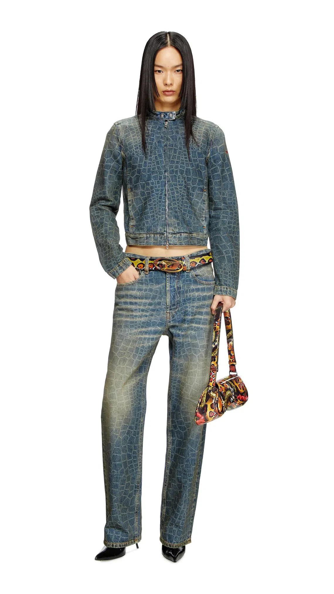 Or break out a subtle yet scaly Canadian Tuxedo in stonewash denim moto jackets ($960) and jeans ($845) treated with an all-over snake print laser.