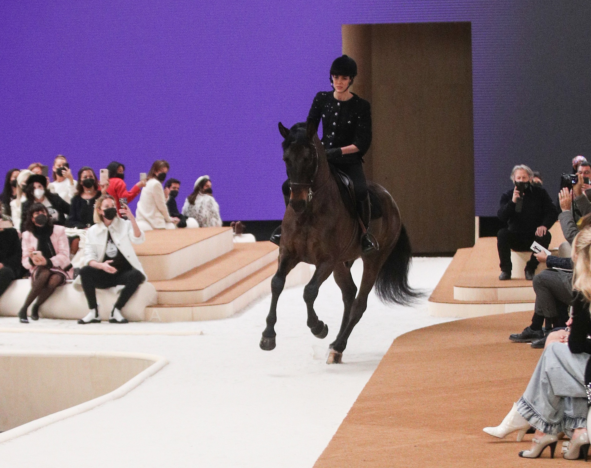 Wearing a Chanel jacket made of black tweed and decorated with sequins, Casiraghi rode out at the start of the show, cantering several times around a catwalk designed to resemble a horse training ring.