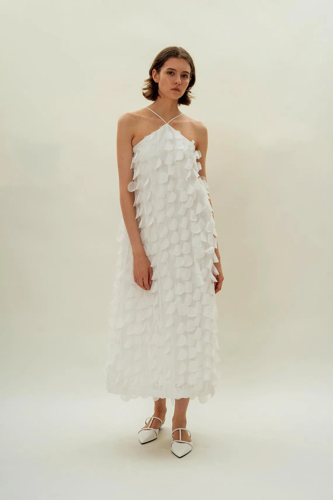 Texture can make an outfit. Singapore label Klarra’s Petal Halter Maxi Dress ($139) reimagines the halter maxi dress in a petal-embellished applique fabric that elevates a simple white dress.