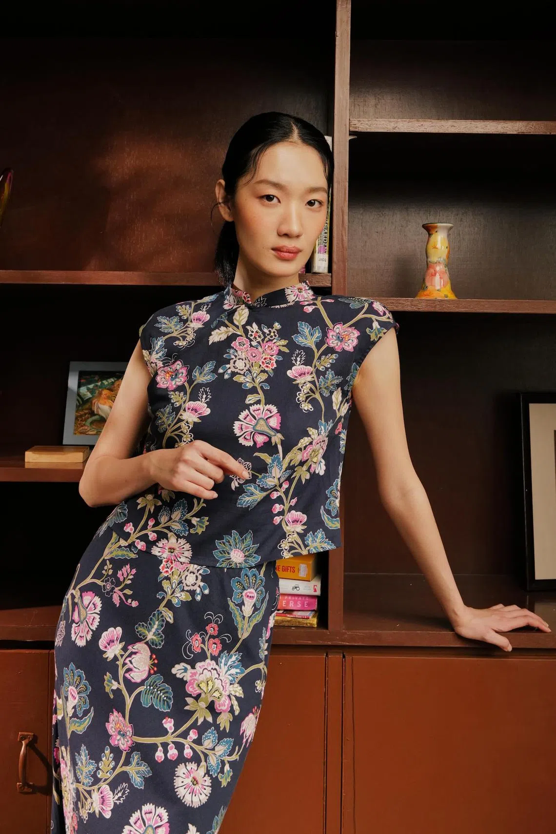Dear Samfu’s Big Sister Cheongsam Top in Navy Paradise ($98).