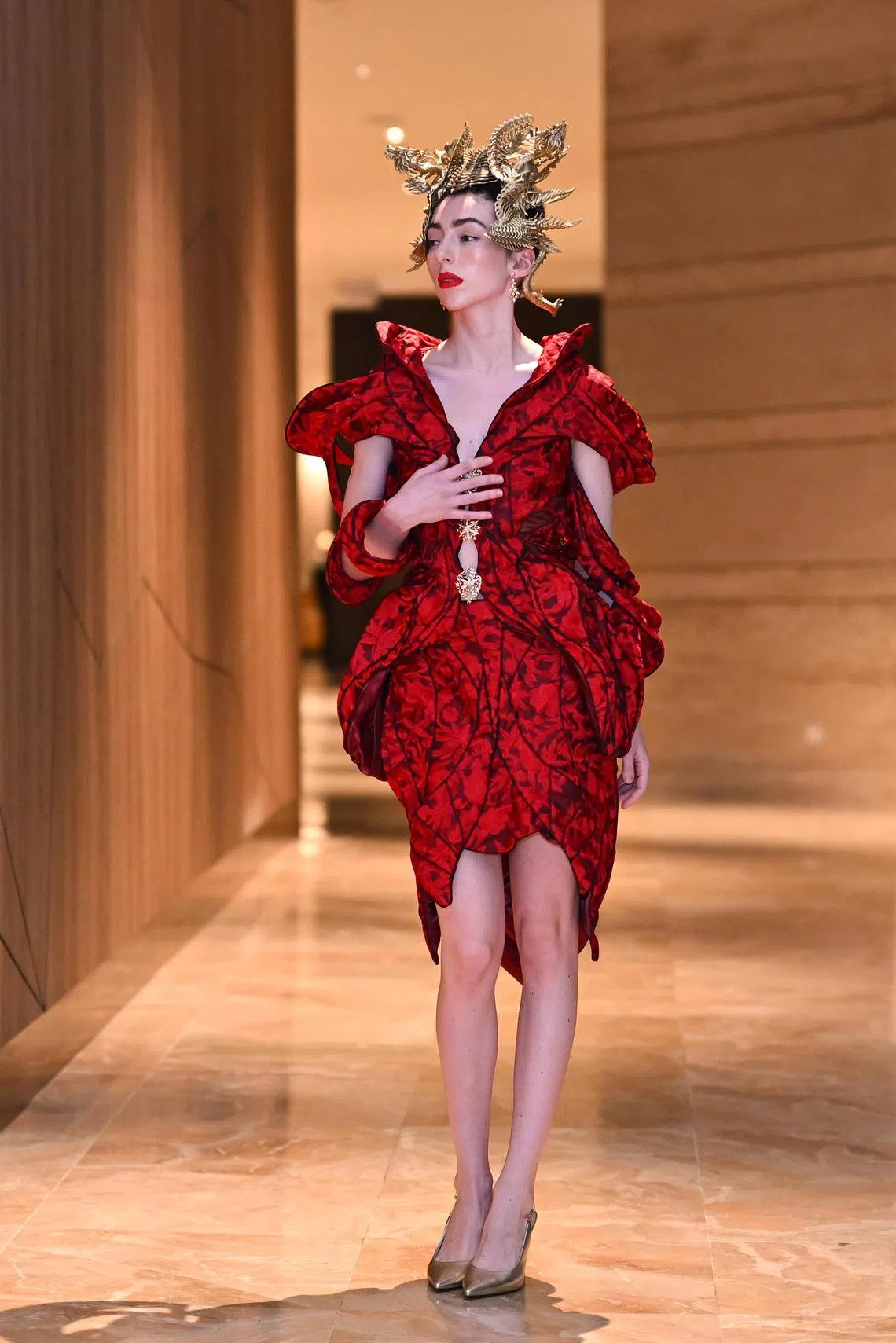 Home-grown label Baelf Design’s Jamela Law stayed true to its ethos as a 3D wearable art brand by designing an avant-garde red kebaya with an equally elaborate headpiece.