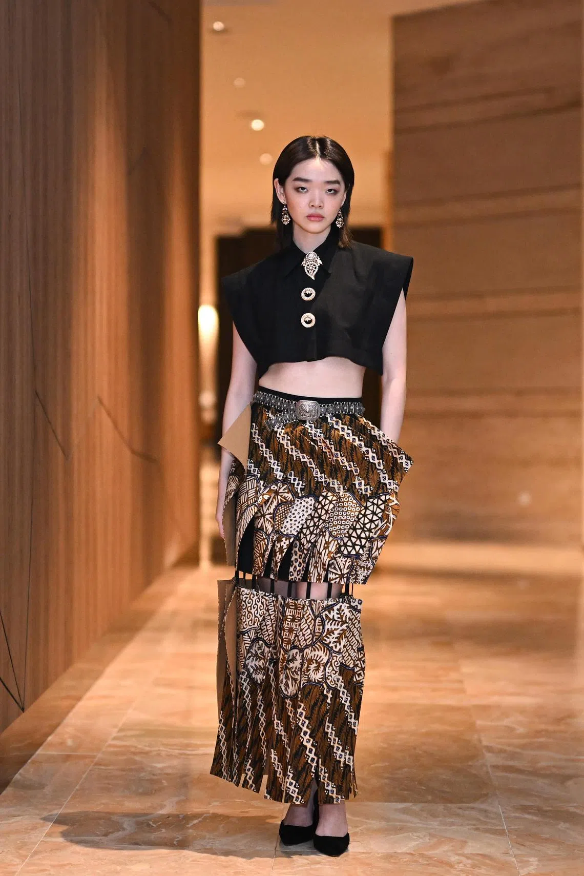 Using hand-drawn batik, designer Sabrina Goh created a sculptural kebaya by deconstructing the sarong. She designed a pleated skirt using the parang batik motif, pairing it with an oversized modern cropped shirt.