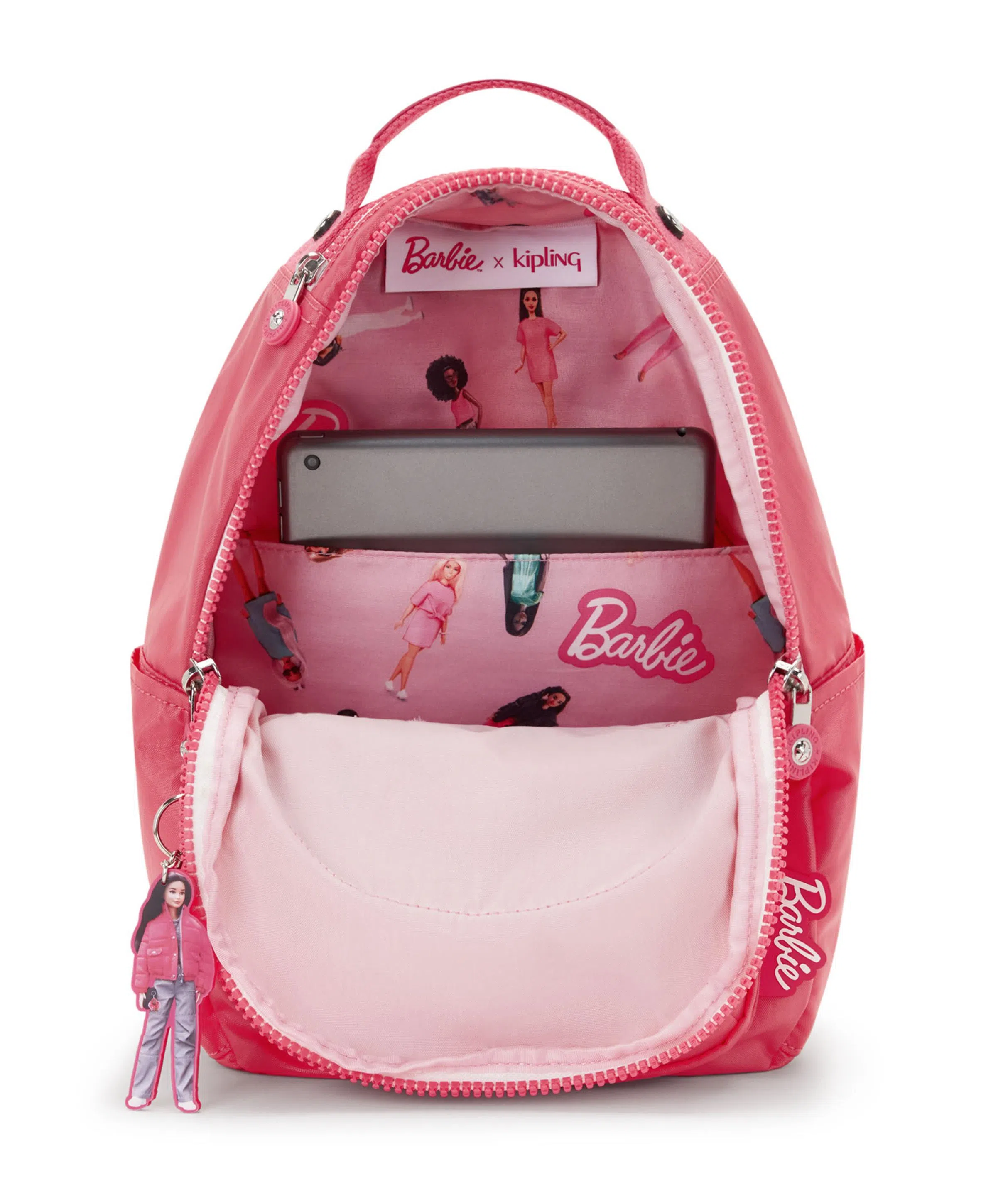 Kipling’s signature crinkle nylon gets a shiny Barbie upgrade in this collection, lacquered with a transparent glaze. Open the bags for a squeal-worthy surprise – the lining features a mix of photorealistic Barbie dolls and Barbie logos.