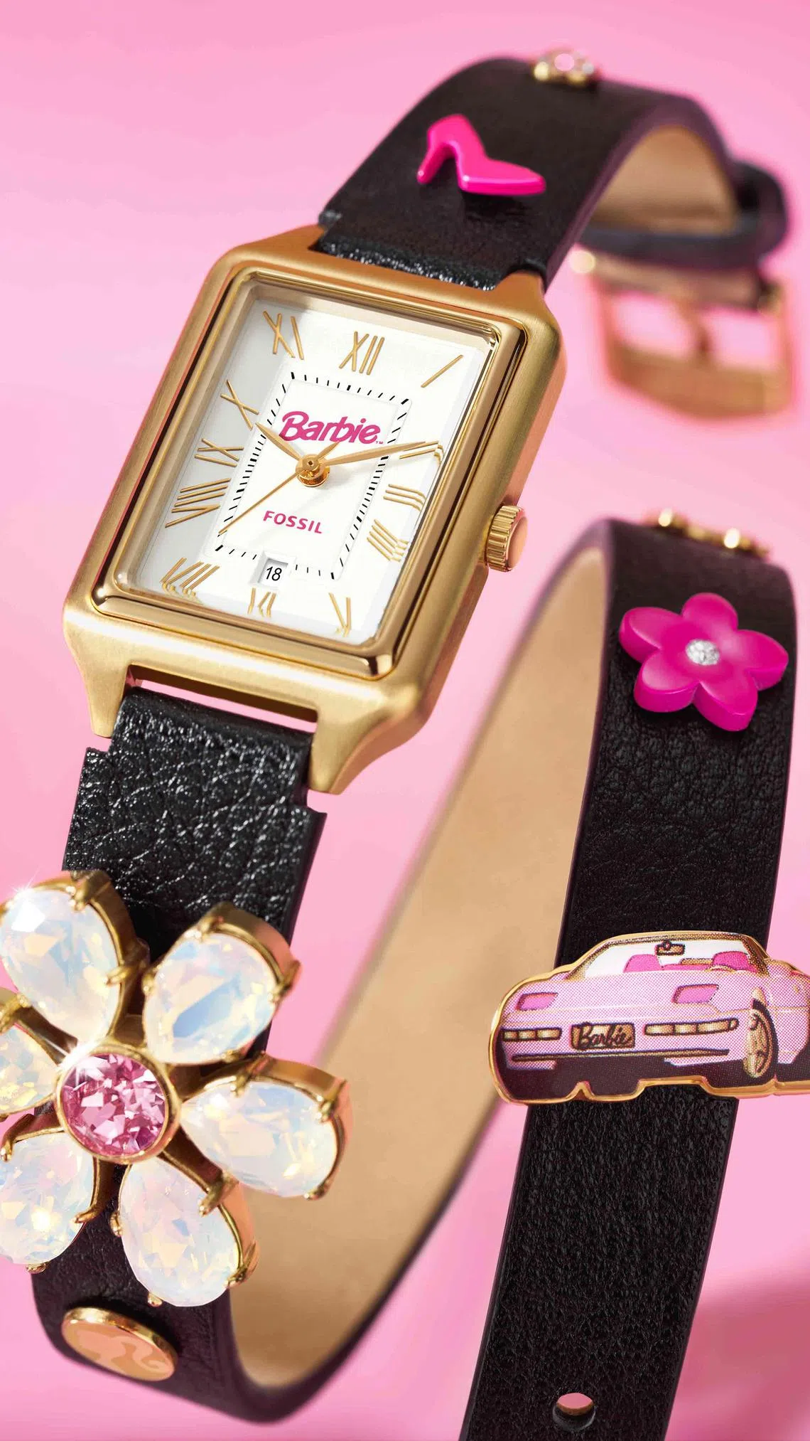 Choose from three timepieces – the quirky Watch Ring ($269) in a flower design; Raquel Watch ($509, right), reimagined with recognisable Barbie icons on the leather strap including bright pink pumps, roller skates and a car; and Carlie ($469), a customisable timepiece.