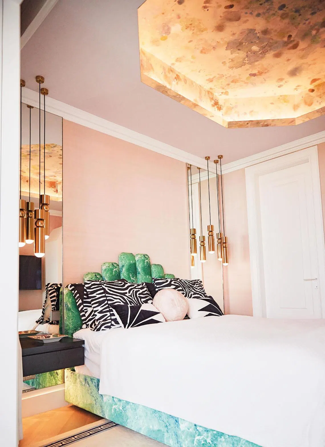 The guest room echoes Ms Savage’s love for Art Deco and zebra prints.