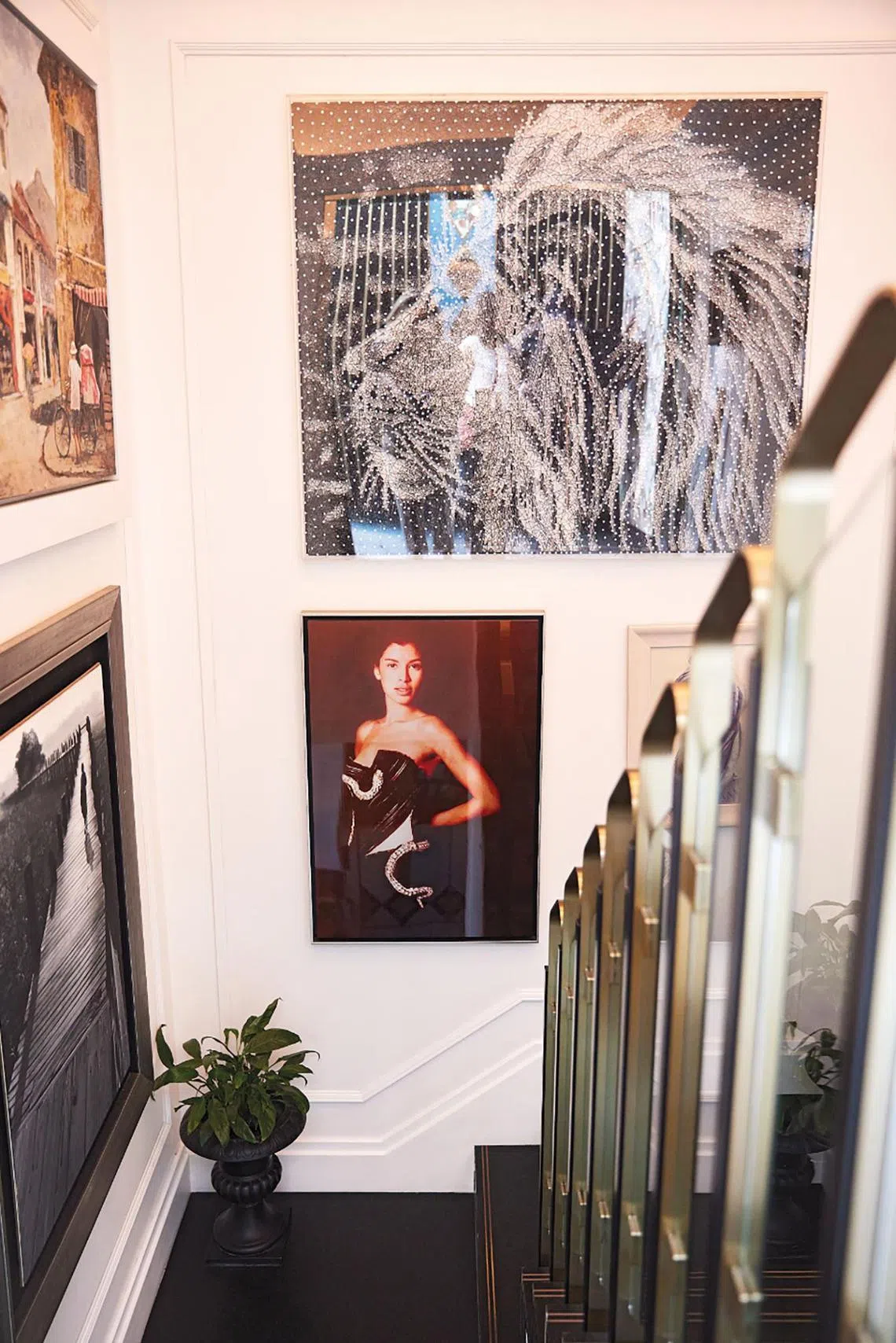 A gallery-like display of artworks, including a photograph of Ms Savage as a model, on the staircase wall.