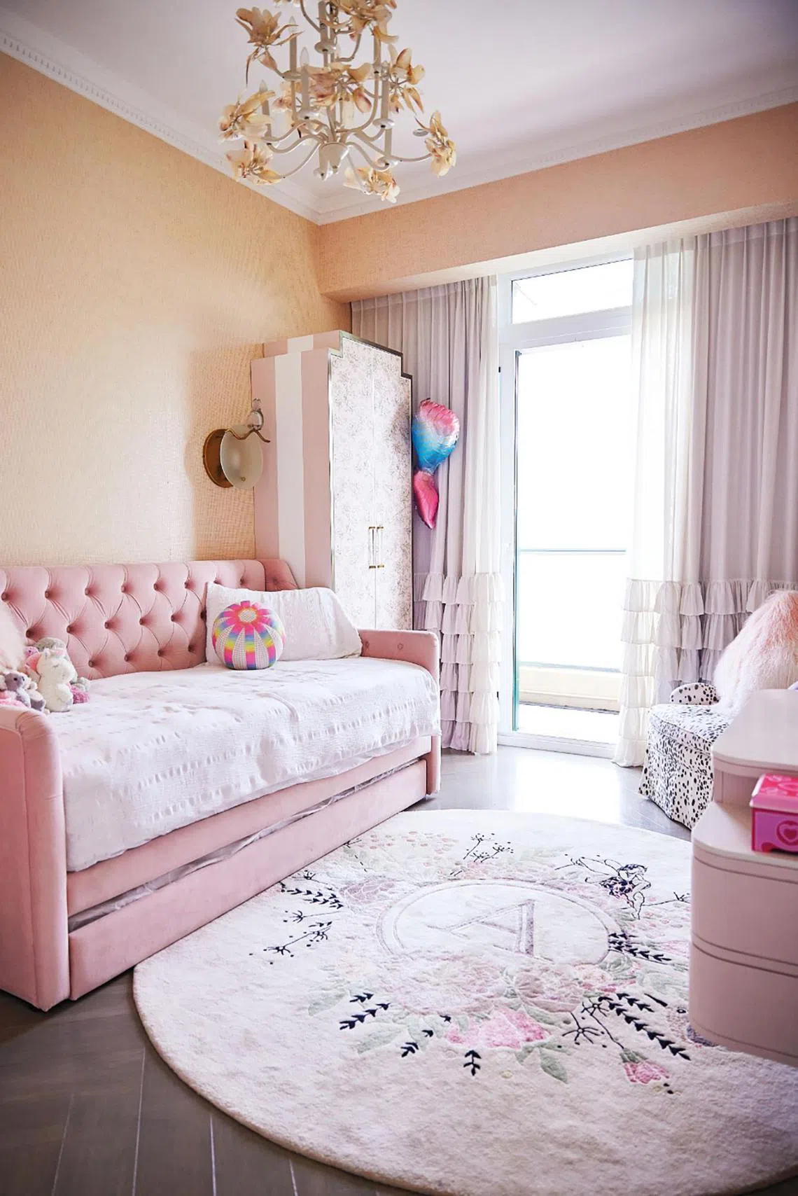 The foyer, with its mirrored panels decorated with lacquered crimson strips, gold finishes and black agate stone, is a wondrous primer for the rest of the apartment. One is first greeted by a spacious, kaleidoscopic living room – flanked by the children’s bedrooms, a guest room and playroom on one side, and the master bedroom and another guest room on the other.