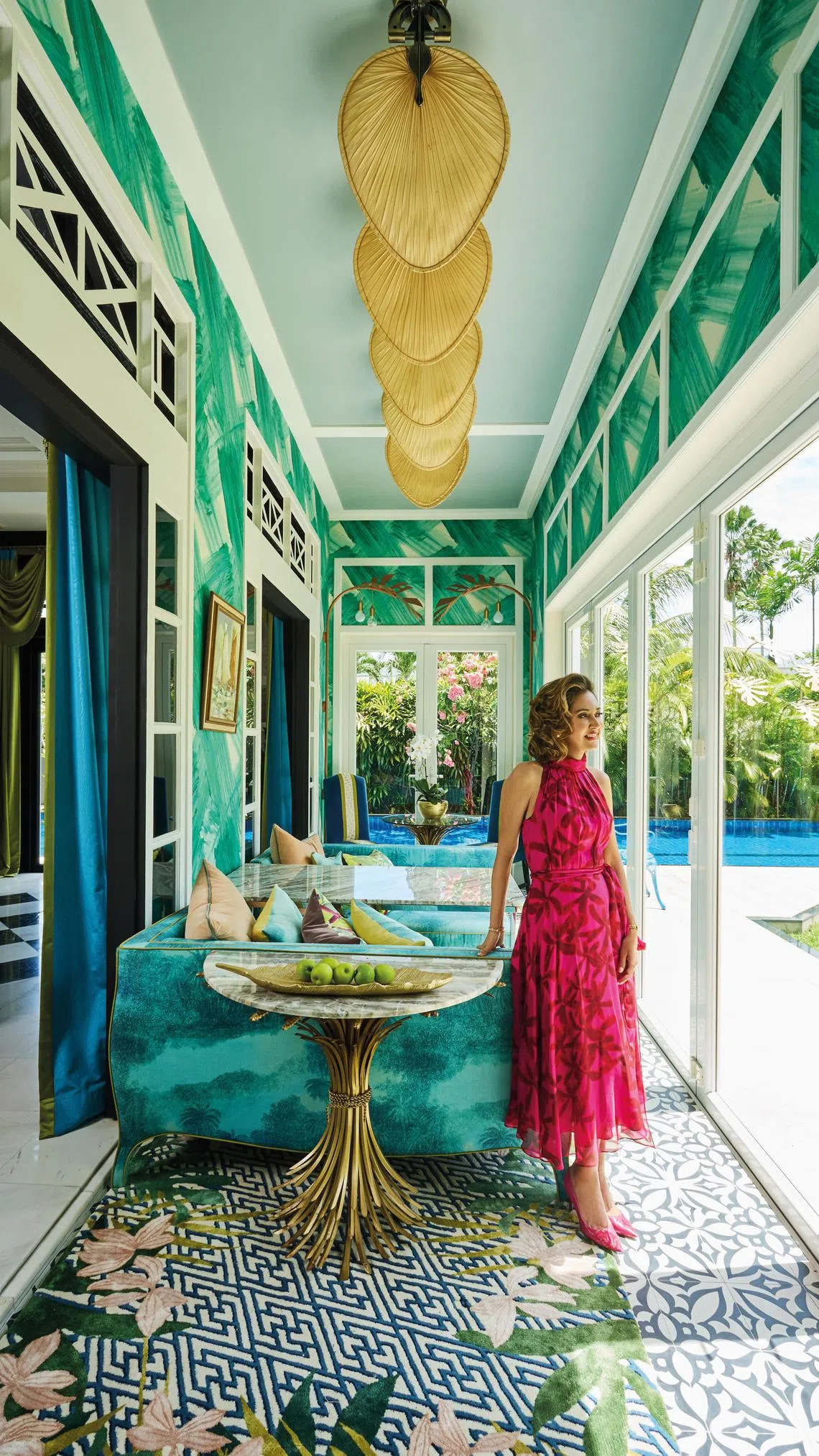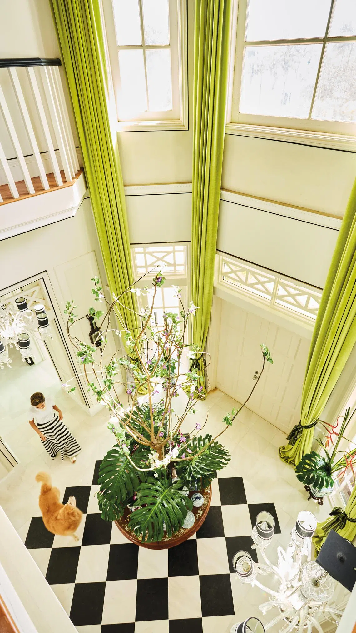 Green is a colour that she favours as it is “God’s neutral” – touches of the colour pop up throughout the home, including on the leaf-print wallpaper throughout the ground floor, and the chartreuse drapes and matching couch in the formal living room.