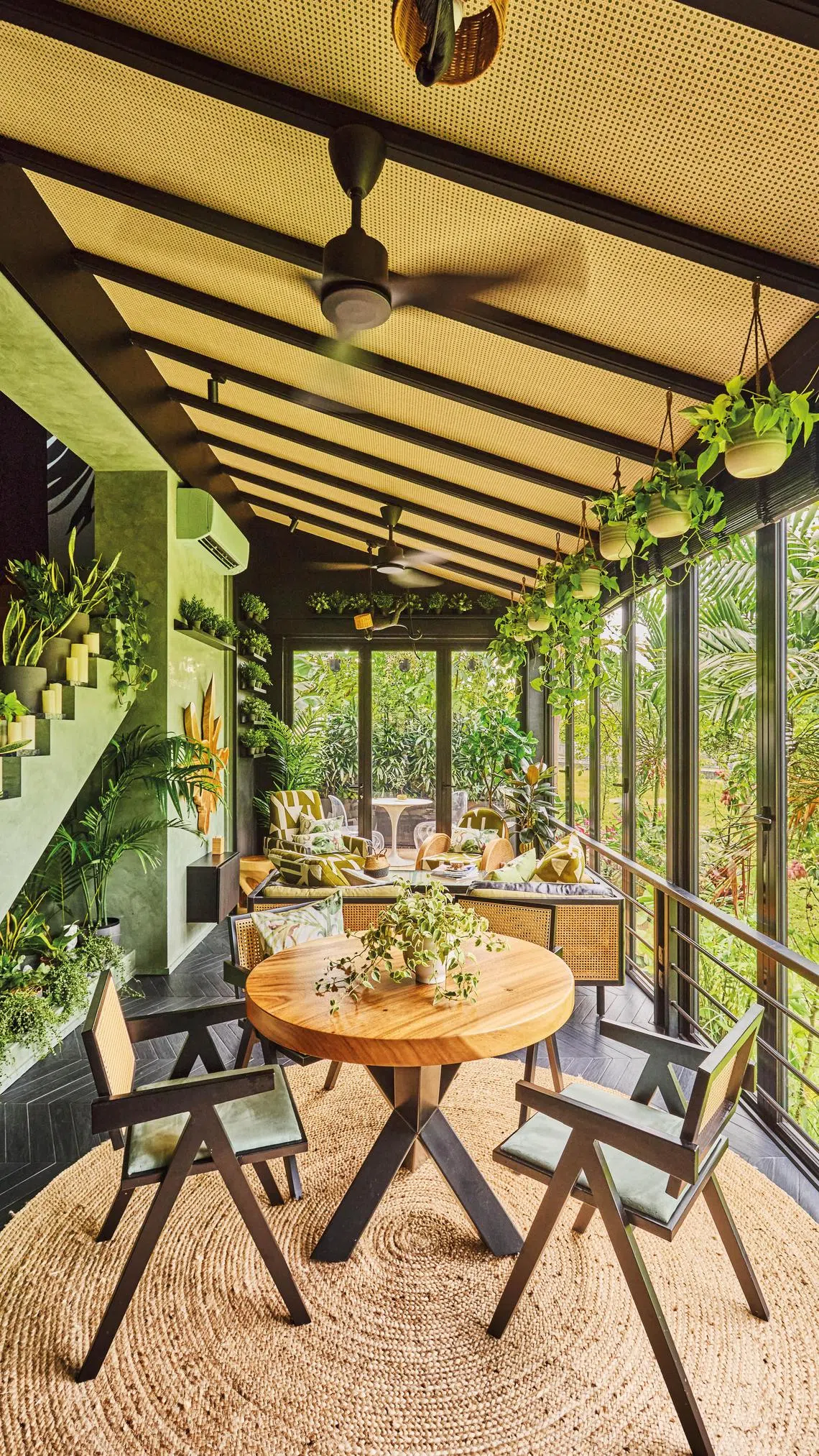 The other main highlight of the house is the idea of bringing the outside in. Located on elevated ground, the back of the home overlooks a lush park. And with the liberal use of glass as well as indoor plants, the effect created in a sitting area dubbed “The Green Room” is of a luxuriant greenhouse.