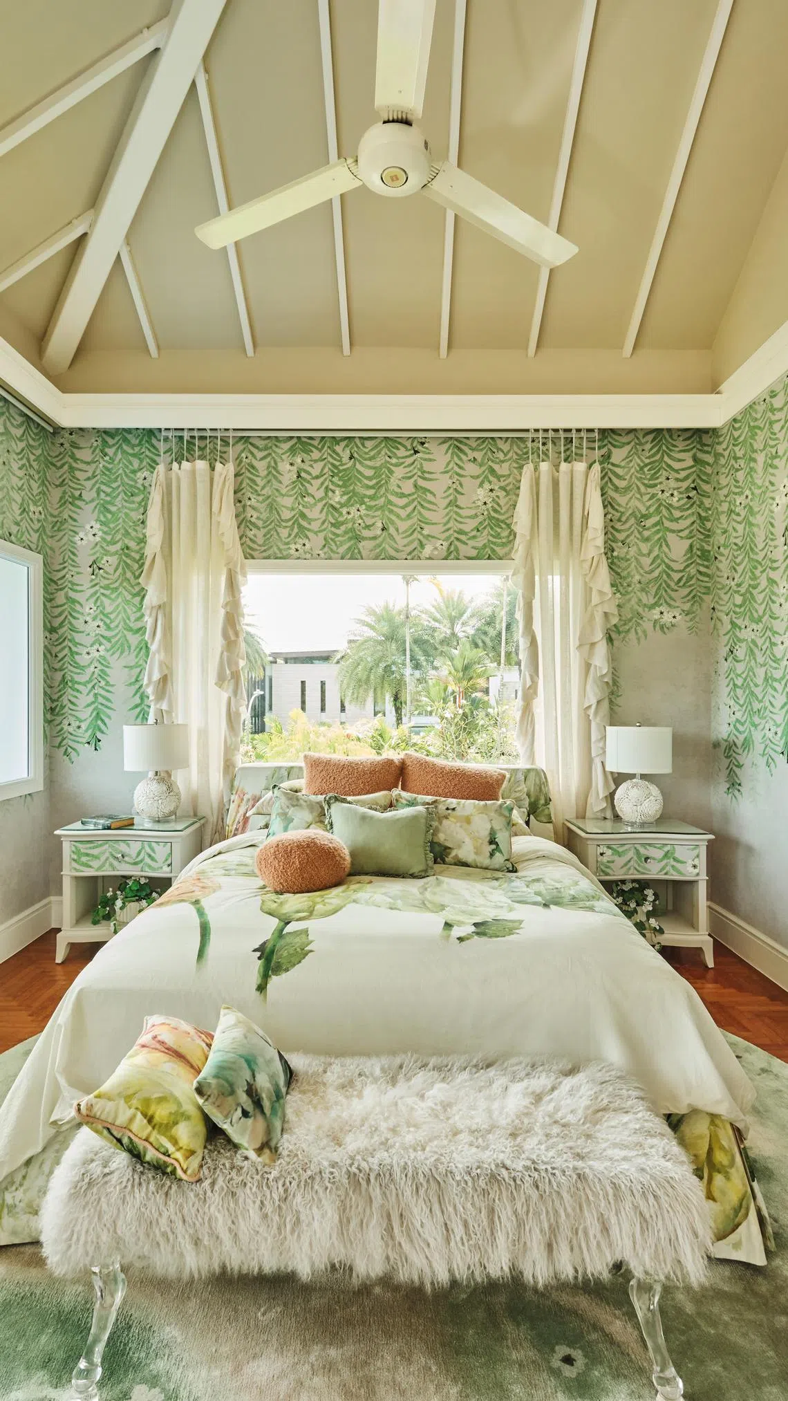 Her sunlight-filled bedroom is an oasis of calm and tranquillity. Overlooking a lush view of trees, the complementary green and cream wallpaper, patterned carpet and plant-patterned couch in the room’s sitting area are livened up with a blush pink, feather-trimmed chair.