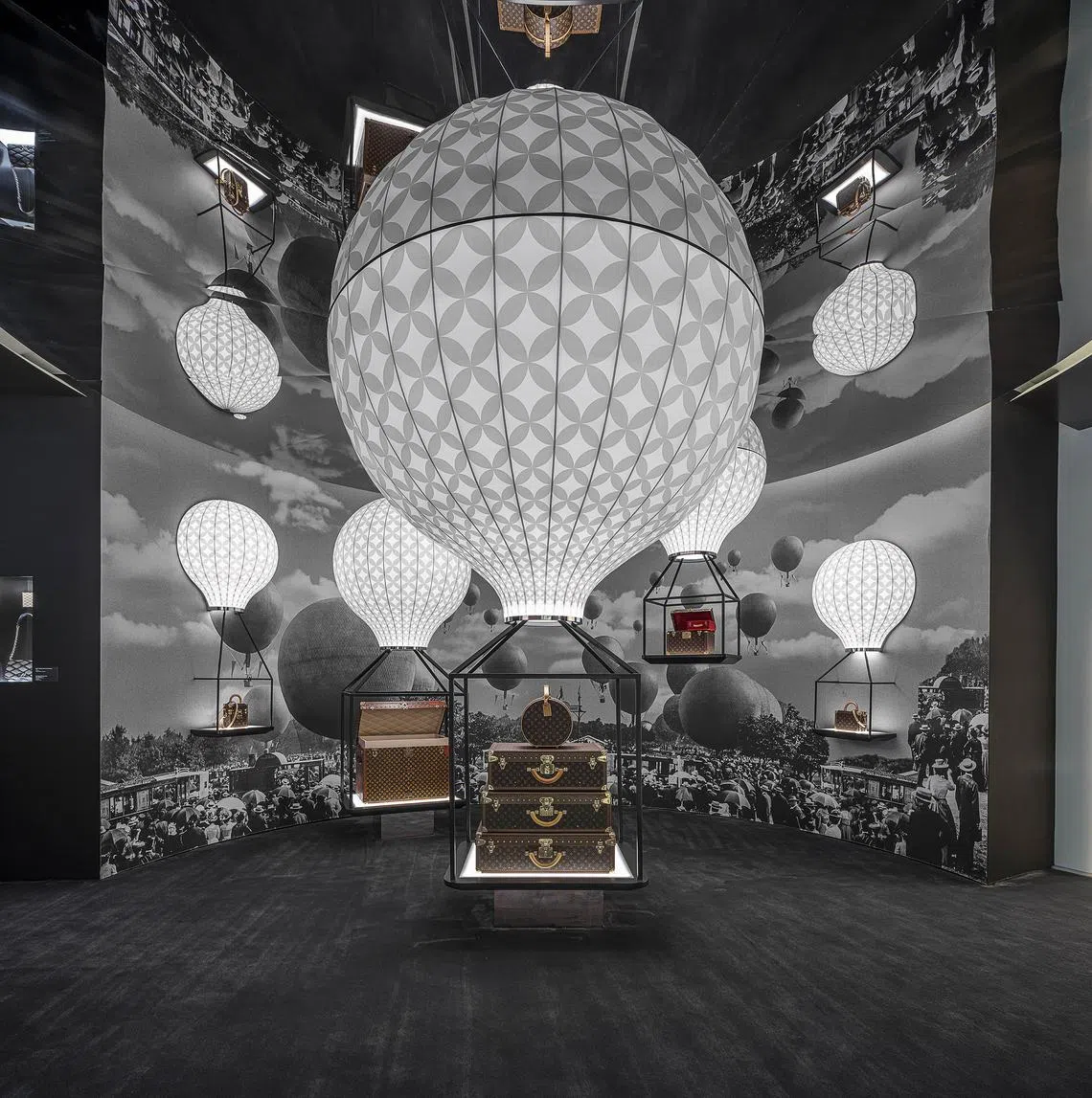 Visitors are welcomed by an exhibition space, decorated with a collection of Louis Vuitton trunks suspended by hot-air balloons. In line with the brand’s tagline celebrating the “spirit of travel”, a historical photograph of a hot-air balloon event in Vincennes Woods, Paris, from the 1900 Paris Exposition serves as the backdrop.