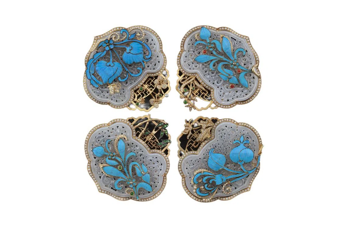 They are made using tian-tsui, a traditional Chinese artistic technique that incorporates the vibrant, iridescent feathers of the kingfisher.