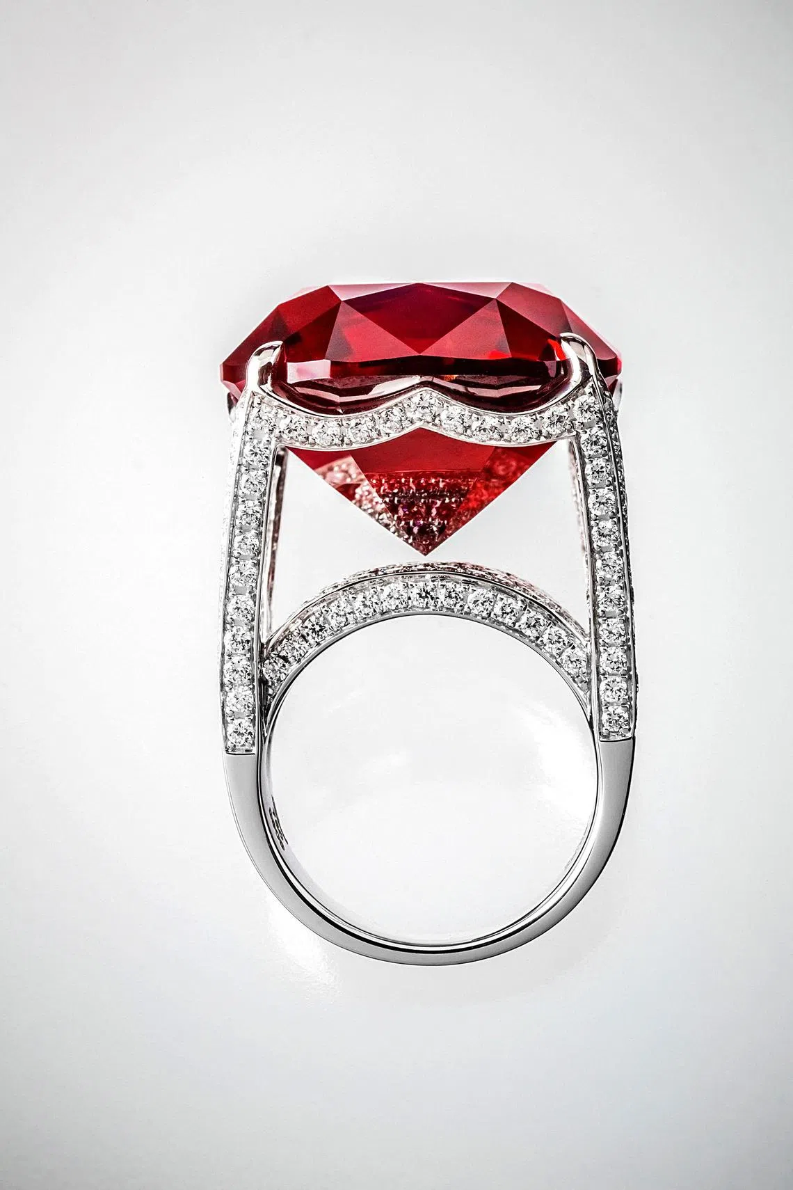 It showcases a captivating 60-carat rubellite as its centrepiece, supported by a diamond-encrusted 18K white-gold frame. Russian Alexander Laut, a master of rare and collectible stones, creates one-of-a-kind handcrafted pieces known for their exquisite craftsmanship and uniqueness, each bearing an identification code and his signature stamp.