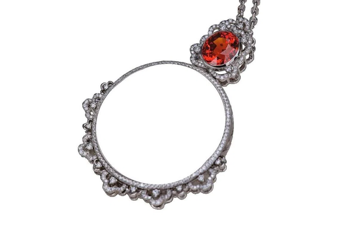 This features a vibrant Spessartine Garnet set in 18K white gold, surrounded by natural diamonds. Designed as a dual-purpose piece, it seamlessly merges beauty with functionality, serving as both a pendant and a magnifying glass adorned with sparkling stones.