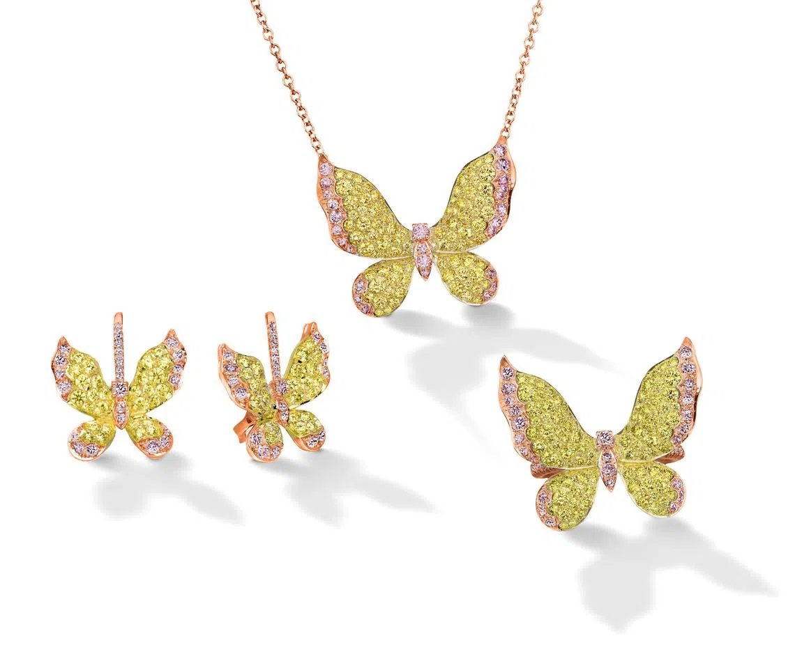These elegant butterfly earrings from Scott West Jewelry are adorned with vibrant yellow and Argyle pink diamonds – rare stones often coveted by collectors and displayed at prestigious auction houses such as Sotheby’s and Christie’s.