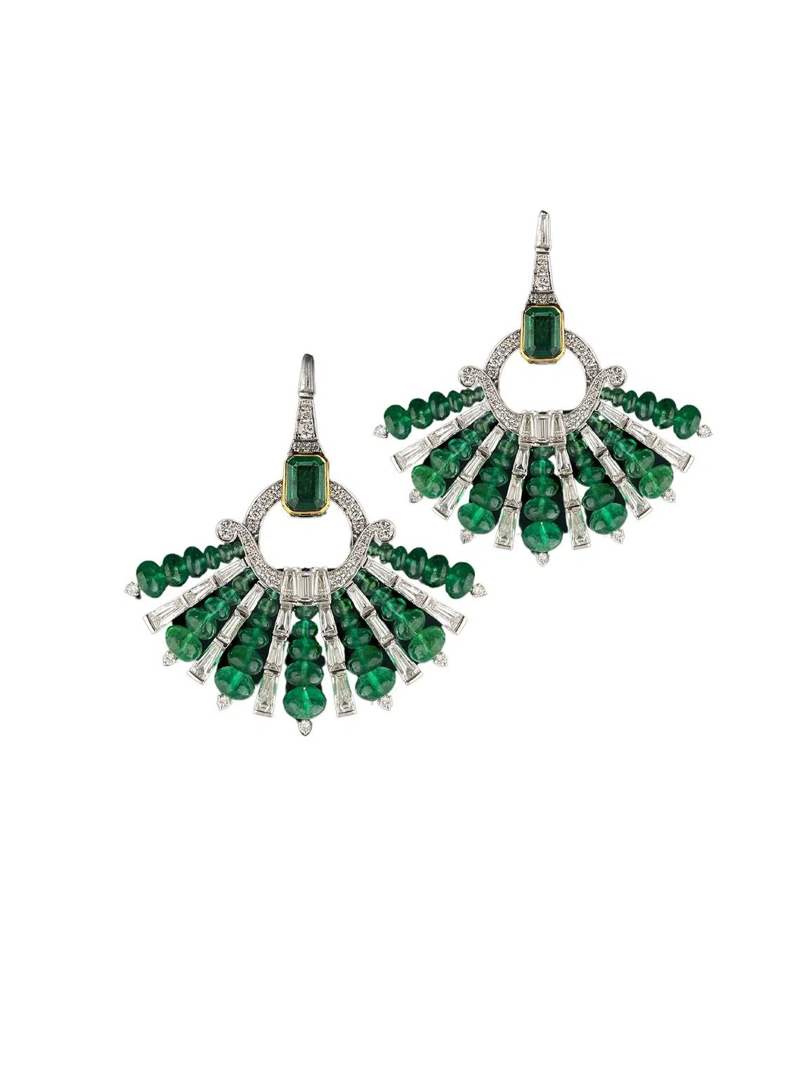 These exquisite earrings from Mumbai-based House of Umrao combine the brilliance of diamonds with the richness of emerald beads, fanning out in an elegant, symmetrical design that exudes both grace and glamour.