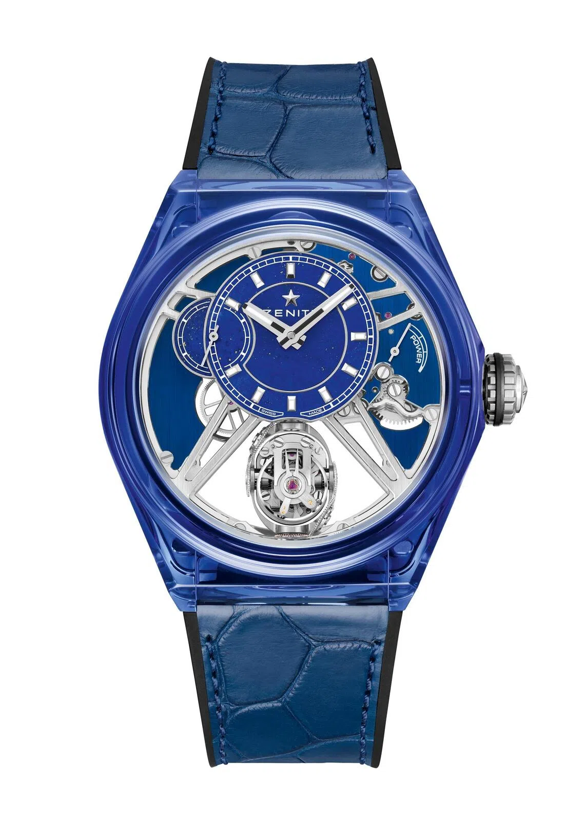 The 46mm cases of the Defy Zero G are hewn from blocks of transparent or deep blue sapphire.