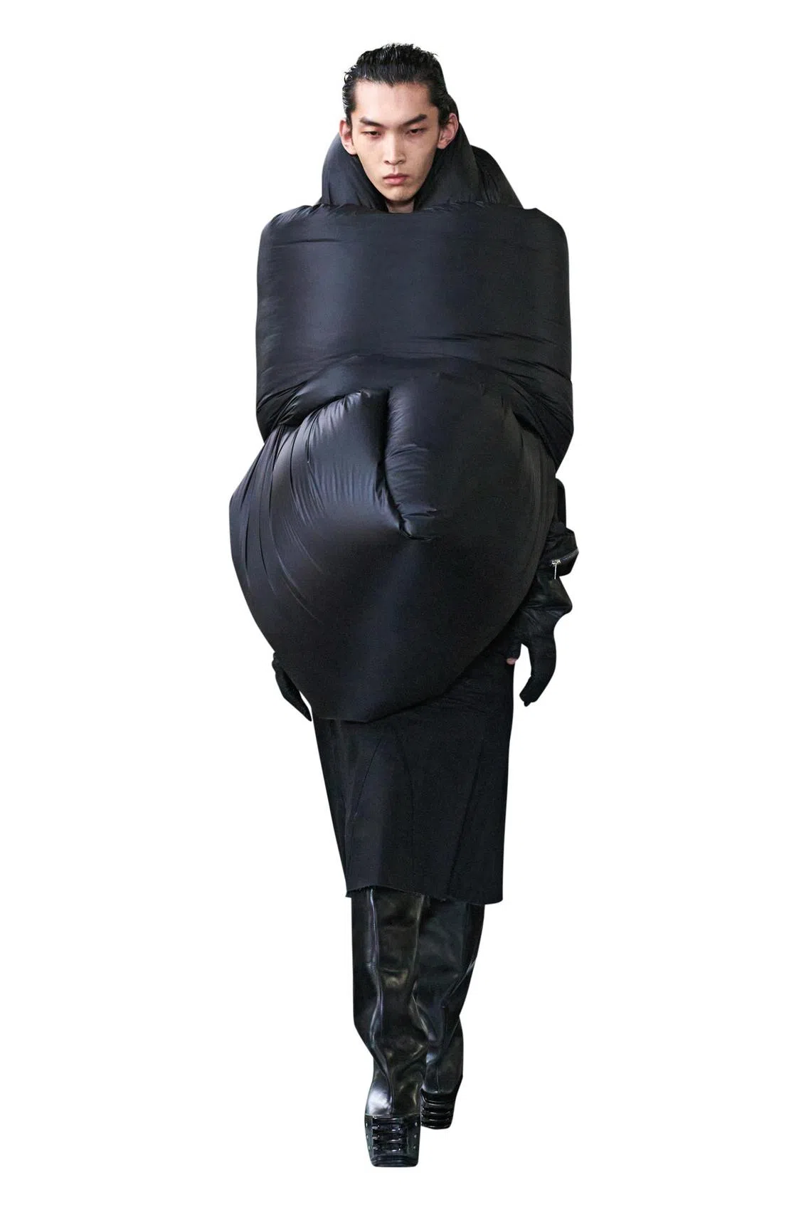 Rick Owens showed puffer jackets in gargantuan pretzel-like silhouettes in its fall/winter 2023 menswear collection.