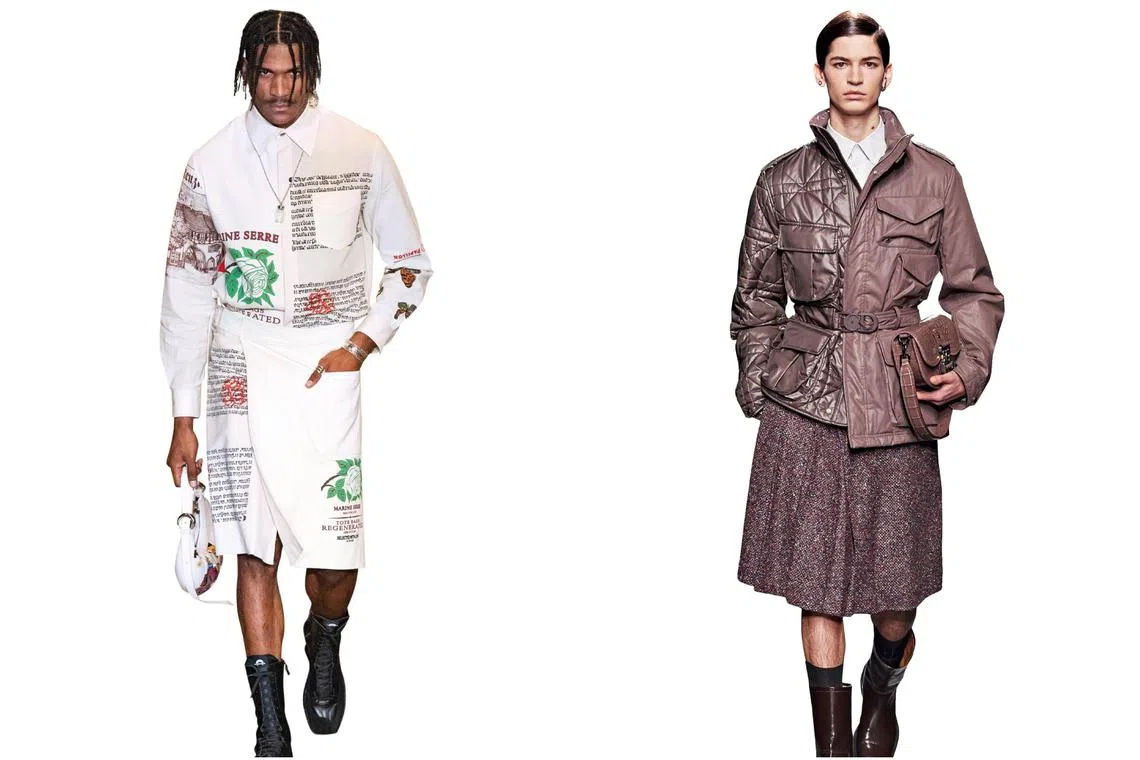 Marine Serre outfit with a skirt (left) and Dior Men outfit featuring a skirt in its fall/winter 2023 menswear collection.